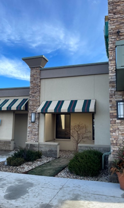 keep the building s finishes landscaping lighting dimensions and proportions the same keep the time of day and time of year exactly the same change the awnings to a solid black in the same style keep the lights non lit