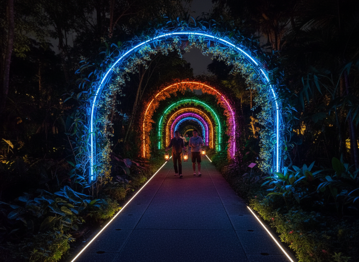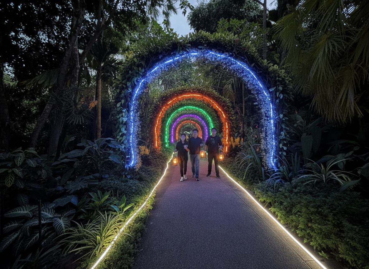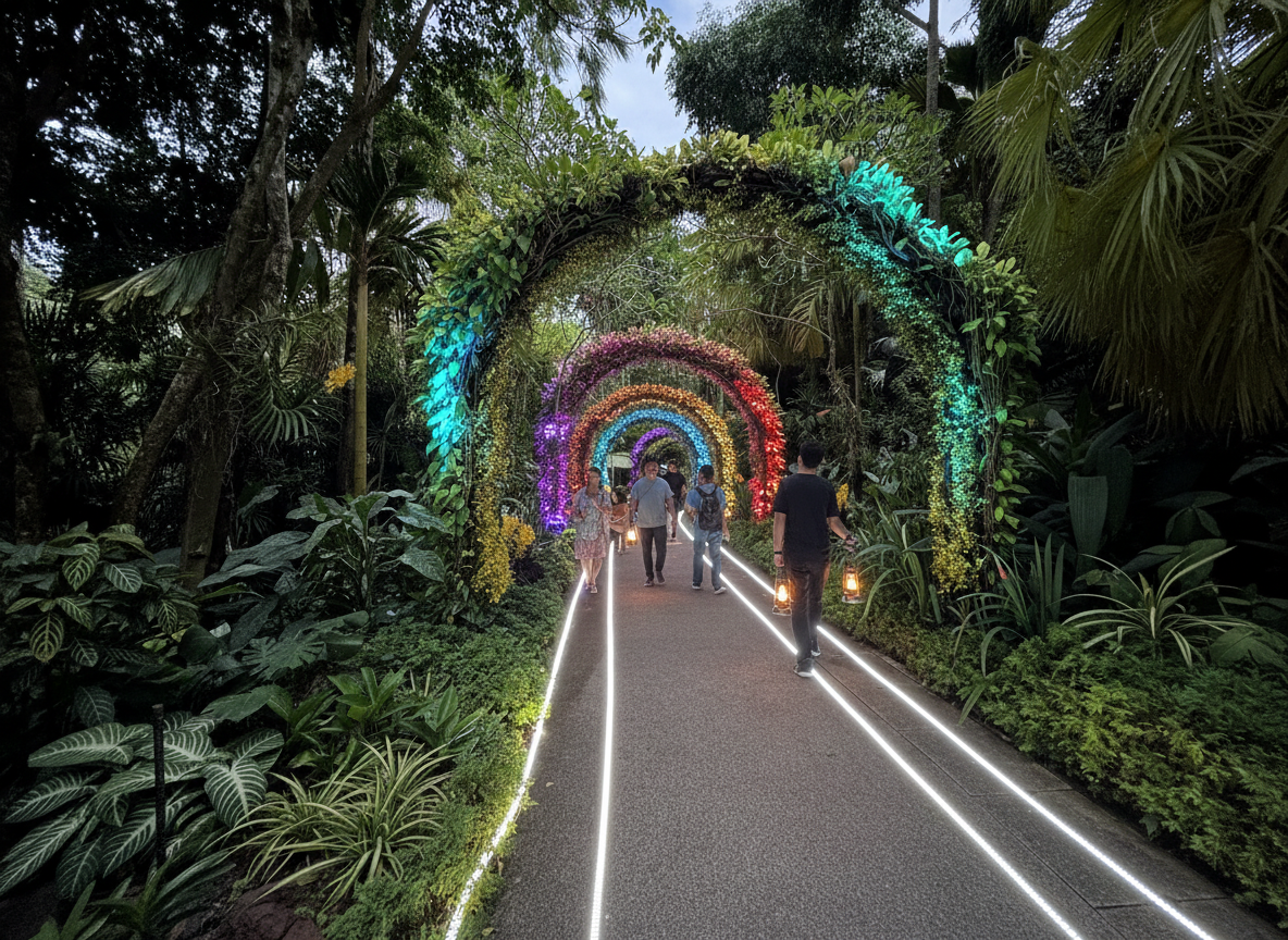 a render of a night installation at the singapore national orchid gardens each archway glows in a different colour people walk through the arches holding oil lamp lanterns multiple white strips of light stretch from the start to the end of the path the rest of the pathway is dark