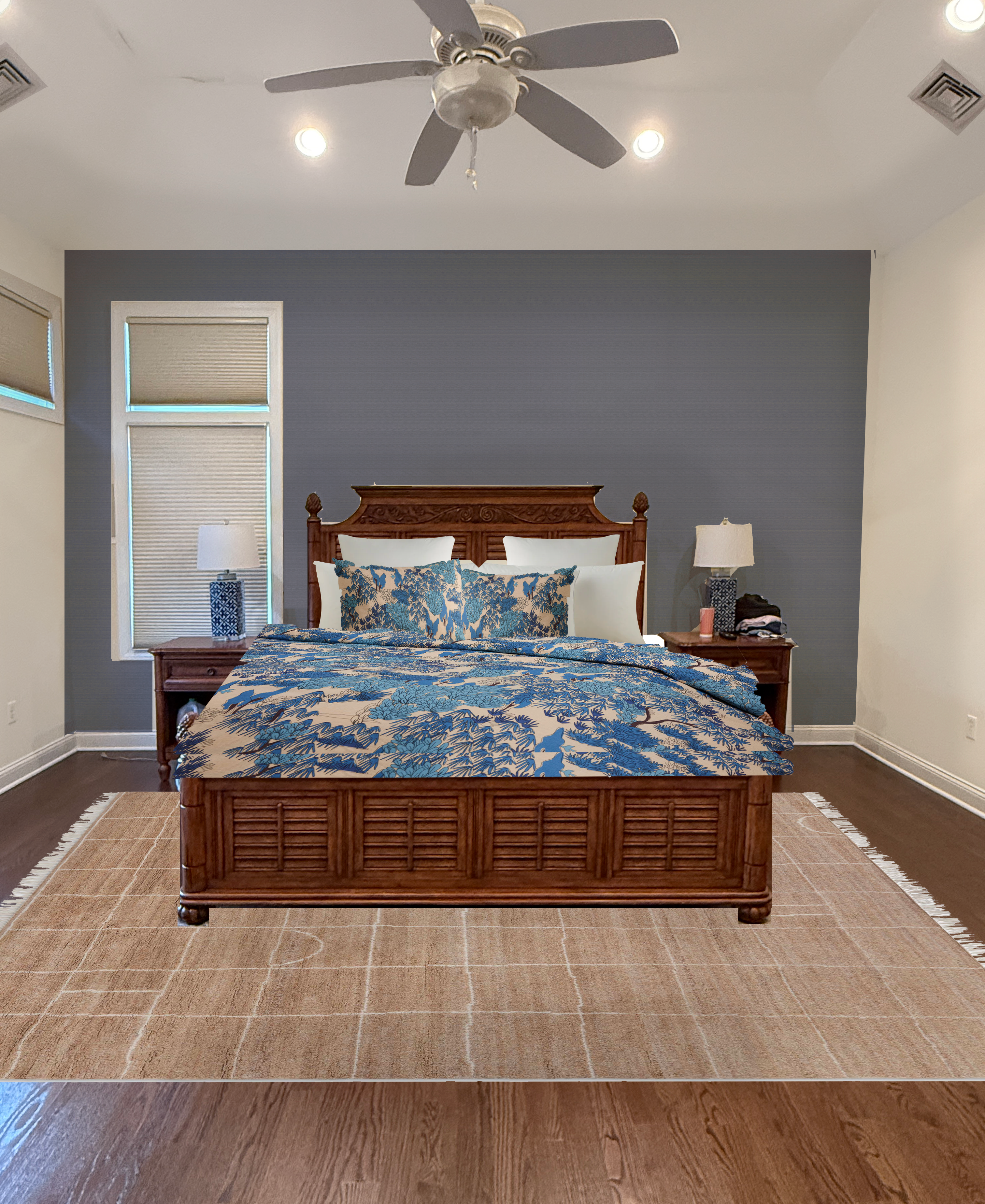the blue wall is a grasscloth texture and teh ceiling fan is white