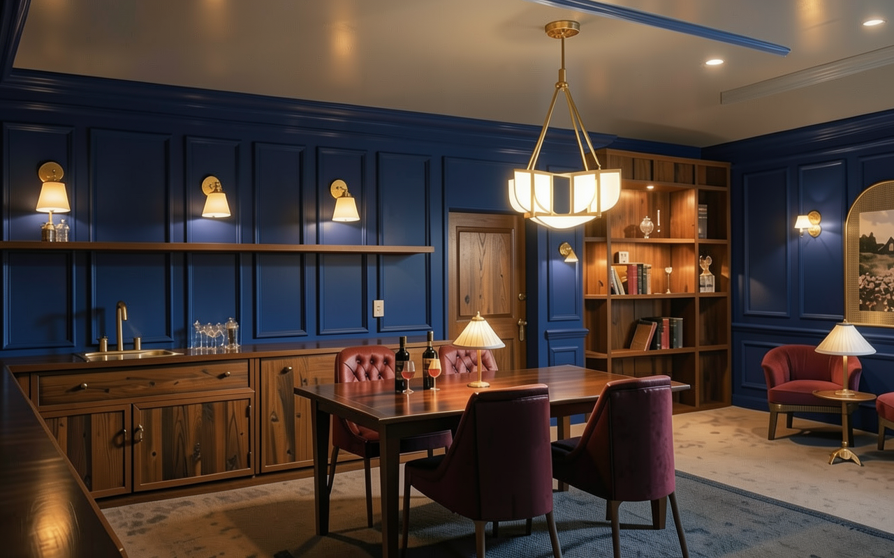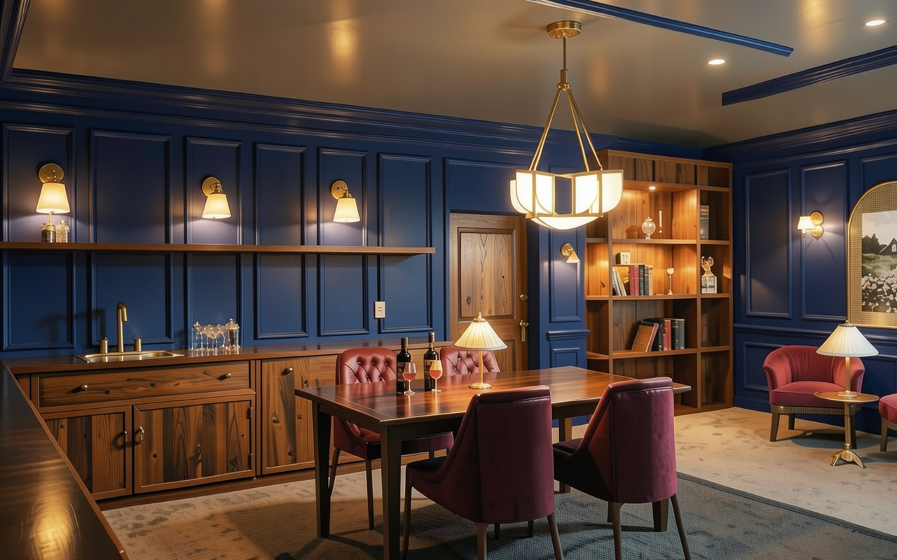 make wall paneling navy blue keep everything else the same make warmer and moodier