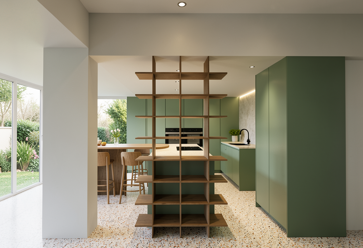 modernist interior shot use the uploaded black and white line drawing strictly as the architectural base geometry preserve the layout proportions wall locations openings ceiling heights glazing and built in architectural elements from the drawing create a highly realistic luxury contemporary interior in the style of a warm desert modern custom home in southern california or palm springs the space should feel open airy refined and minimal with a strong indoor outdoor connection and a polished architectural marketing render quality architecture and spatial character open concept great room with tall ceilings clerestory windows large sliding glass doors clean rectilinear forms broad uninterrupted wall planes and a spacious uncluttered composition material palette light natural oak wide plank flooring with subtle grain and a matte finish warm white painted drywall or smooth plaster walls a large dark charcoal or deep taupe plaster or concrete feature wall light stone surfaces with soft veining dark bronze blackened steel or muted warm metal accents all finishes should feel tactile matte expensive and realistic with restrained reflectivity color and mood soft neutral palette of warm whites cream beige sand oak taupe charcoal and muted stone gray no saturated colors the atmosphere should feel sunlit calm sophisticated and warm without becoming overly yellow or orange furniture and staging stage the main living area with understated contemporary furniture low profile cream or off white sectional sofa rounded lounge chairs in textured ivory boucle or similar fabric simple rectangular wood coffee table slim side table with a modern lamp large neutral area rug with subtle texture minimal decor such as books trays and ceramic vessels keep styling sparse believable curated and premium lighting primary illumination should come from bright natural daylight through large glazing use late morning or early afternoon sunlight with a clear sky and a natural warm tone include realistic sunlight patches on the floor and furnishings with soft to medium shadow definition supplement with subtle recessed ceiling downlights decorative table lamps a metal mesh chandelier centered over the living room and warm accent lighting that supports the daylight without overpowering it exterior through glazing show an upscale desert modern outdoor setting with a pool patio pale hardscape desert landscaping palms sculptural plants and distant mountains or hills the exterior should feel bright luxurious and consistent with a southern california desert modern residence camera and composition use an interior architectural camera approximately 22 mm full frame equivalent at about 5 feet eye level keep verticals straight and avoid keystone distortion compose from a corner of the room to show depth toward the outdoor view architecture