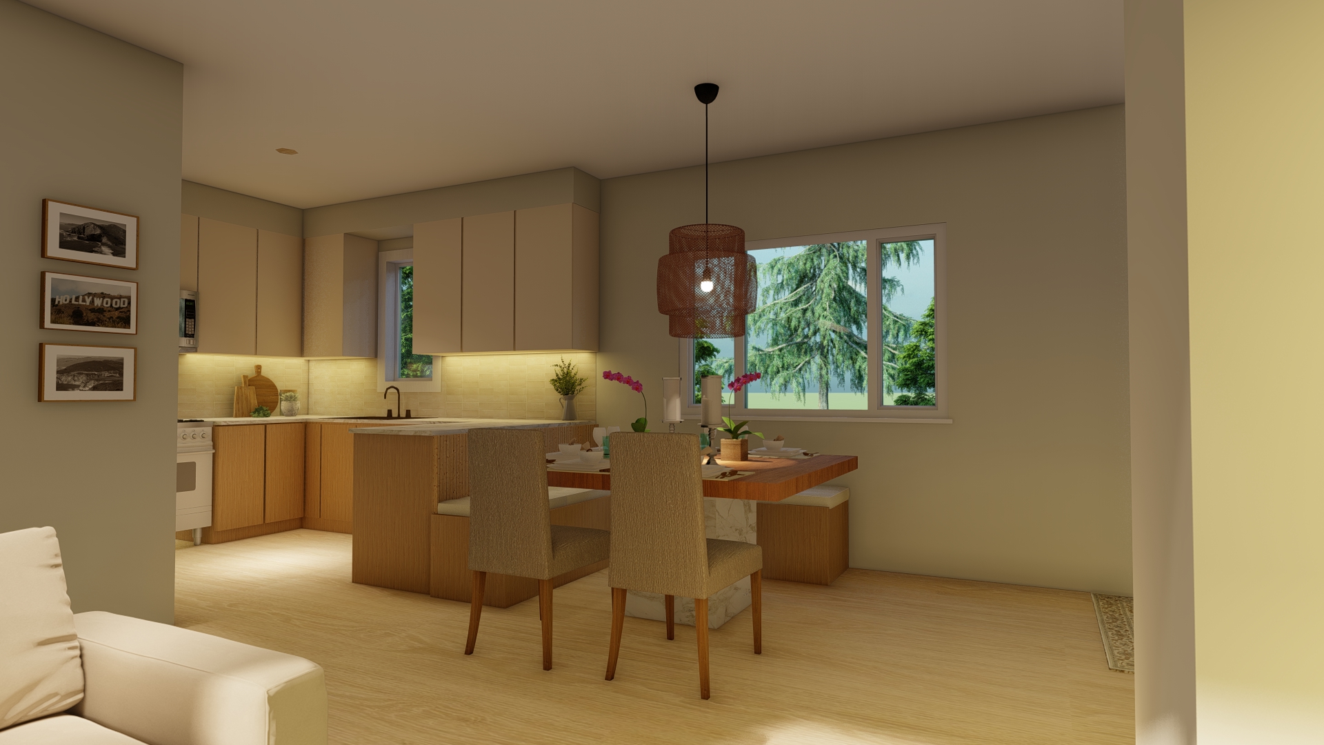 flooring medium natural oak with soft beige undertones medium contrast grain matte finish diffuse reflectance around 0 55 0 65 minimal specular highlights subtle warm undertone shift under ambient light kitchen cabinets warm medium tone wood with golden brown chroma fine linear grain satin finish reflectance around 0 35 0 45 controlled specular response slight gloss anisotropy generate calibrated albedo values roughness maps and normal intensity consistent with real world wood surfaces maintain color fidelity and avoid oversaturation match tones exactly for material replication in interior visualization