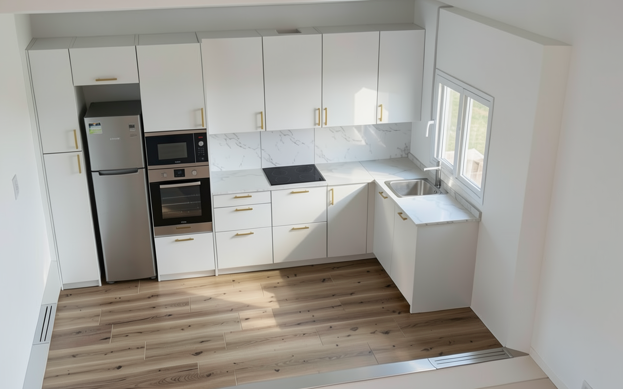 el frigorifico va en el hueco que hay justo a la izquierda del horno la medida del frigorifico es igual que el hueco debe ser un modelo combi a ade decoracion en la encimera
