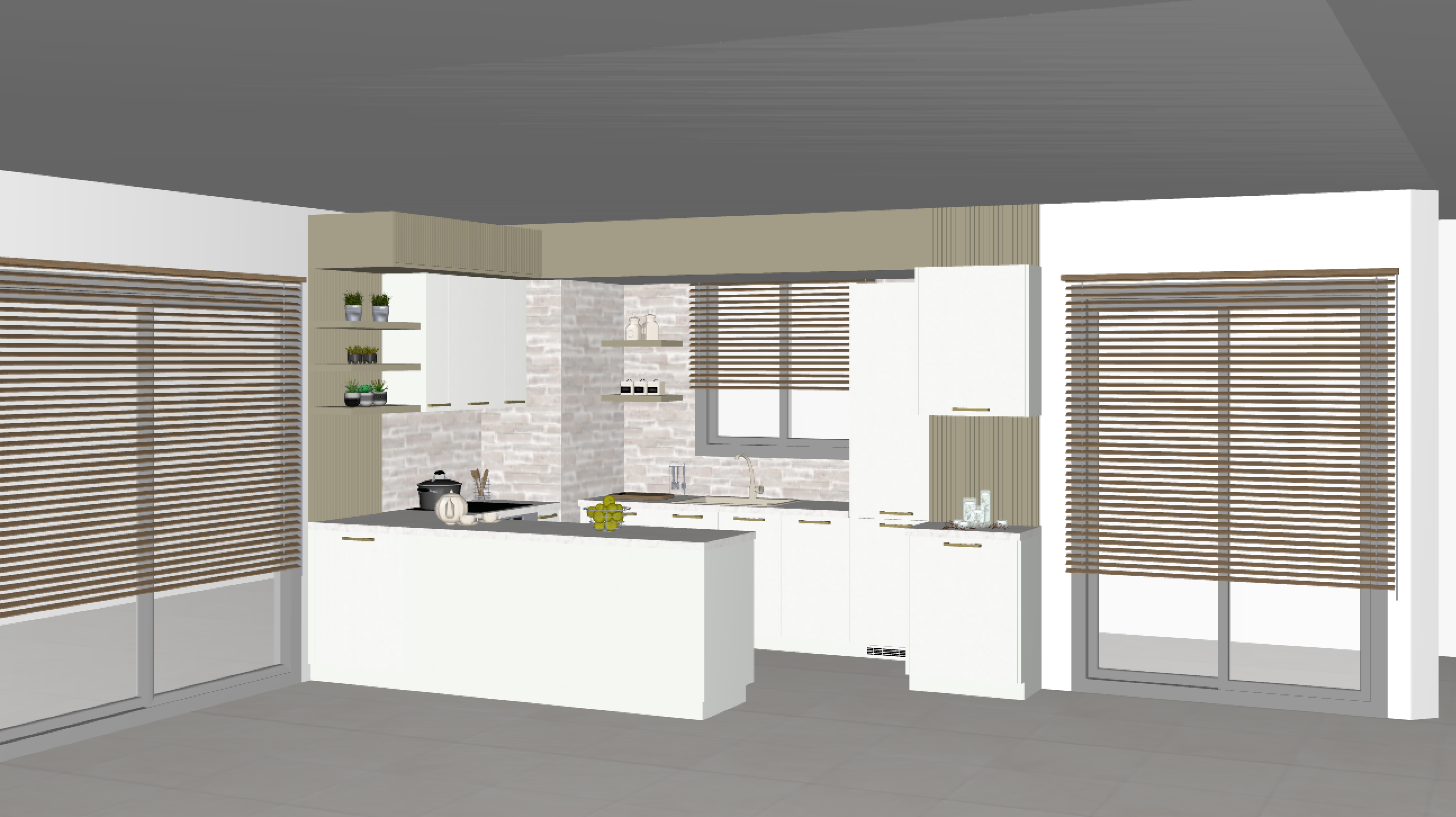 a modern kitchen interior with a minimalist design the left section has beige walls and wooden shelves with a natural oak finish the bottom shelving unit is white with wooden borders the right section features a tall sleek metallic silver refrigerator labeled with aeg surrounded by white cabinets and shelves arranged in an abstract geometric pattern the right oven and microwave have a shiny chrome finish the atmosphere is clean modern and airy with soft natural lighting creating a cozy and functional ambiance