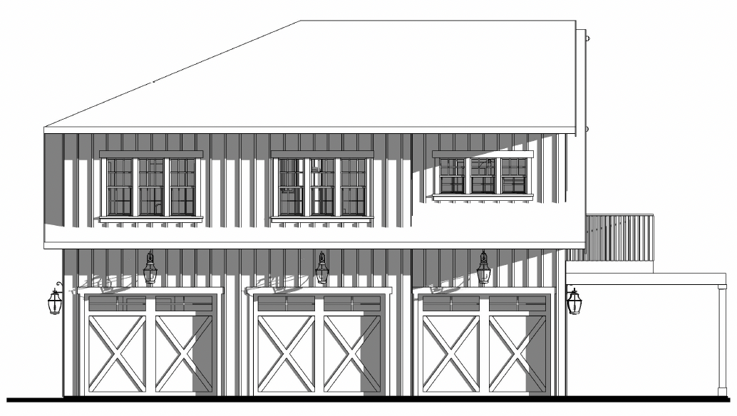 recreate my drawing in the modern farmhouse exterior style with heritage sage green board and white batten siding use natural wood columns white frame windows and wood brown garage doors with farmhouse crossbuck detailing include a brown coloured asphalt roof white trim include a pergola next to the balcony on the side balcony is charcoal metal railing lighting is soft late afternoon light blue sky gentle shadows use realistic textures and high quality materials include simple landscaping green lawn minimal shrubs a few background trees and a clean gravel driveway render at high resolution with a straight on or slight 3 4 view ensure it looks 3 dimensional final result should visually match the reference style if provided colour palette and overall mood while keeping the exact form and roof lines of my drawing