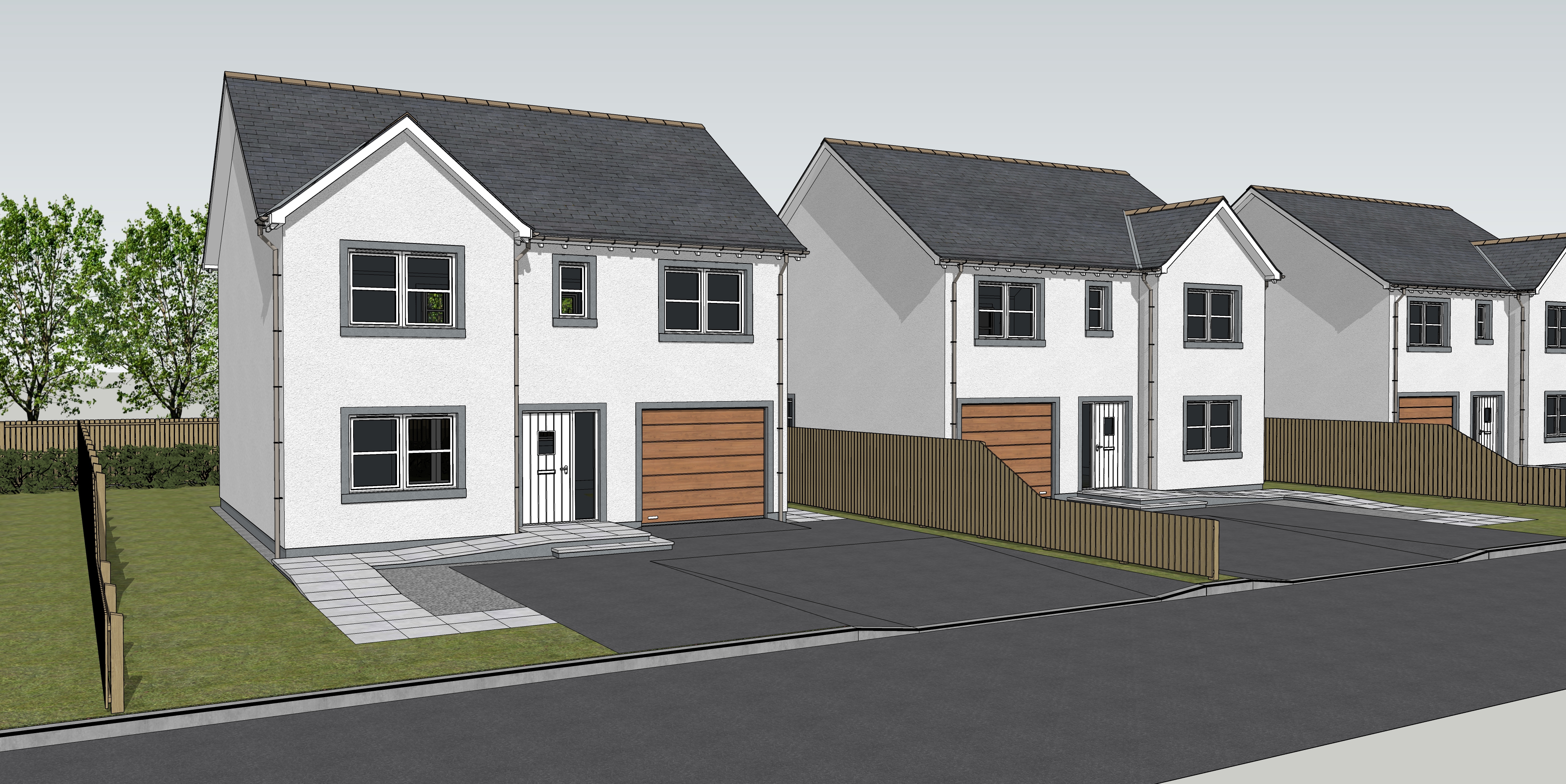 create a photo realistic render of this image keeping the same colours and features but with some soft landscaping to the garden and a family car on the driveway