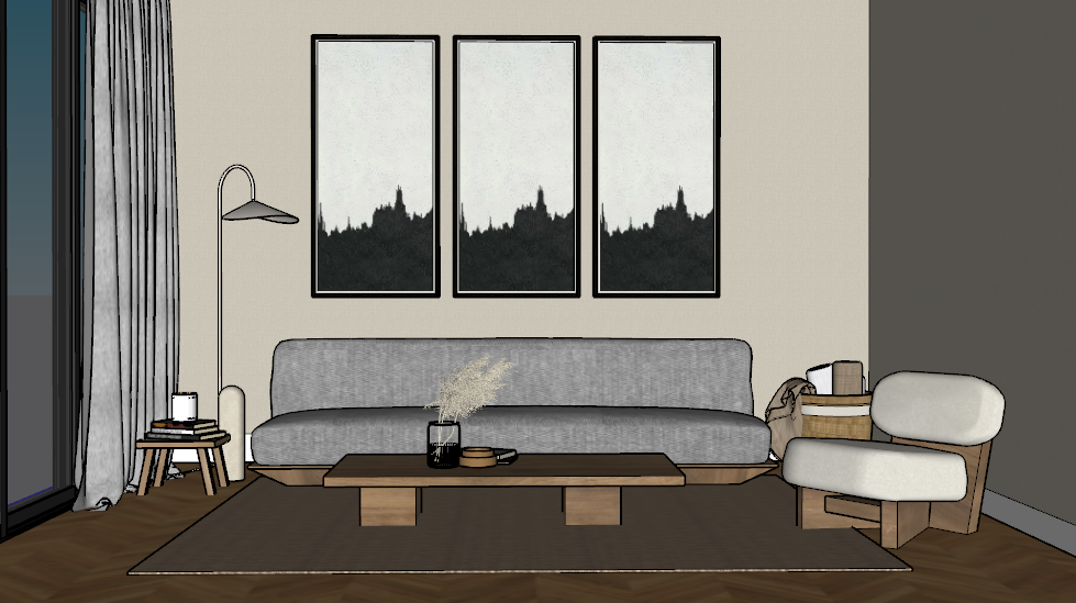 photorealistic editorial interior render scene framing front facing wide shot of a minimalist living room straight on perspective maintain the exact composition proportions and placement from the reference sketch no reinterpretation elements herringbone wooden floor with natural oak tone visible grain and subtle variation low rectangular coffee table in darker stained wood matte finish rich grain texture large sofa with soft wide knit upholstery in natural grey fabric matching armchair on the right with the same textile quality and wooden structure beige wallpaper with woven textile texture covering the wall three vertical black framed artworks in black and white identical with real oil paint texture visible brush strokes and pigment irregularities no redesign floor lamp ferm living style slender structure matte beige metal with stone base light grey almost white curtains in soft plain fabric small wooden stool on the left with stacked books and a candle on top natural fiber rug jute or similar under the coffee table visible coarse weave on the table dark glass jar with pampas grass a golden metal lid beside it and a closed book additional decor on the right basket and textile in neutral tones natural materials lighting natural sunlight entering from the left side soft but directional casting long realistic shadows across the floor and furniture maintain original light direction and intensity color texture warm neutral palette beige soft greys warm wood tones strong emphasis on tactile realism visible wood grain and imperfections thick woven upholstery texture matte painted metal natural stone base with subtle grain coarse rug fibers textile wall texture style high end interior editorial photography calm refined minimal styling scandinavian influence quality ultra realistic high resolution physically accurate materials global illumination soft shadows subtle imperfections constraints do not change layout camera angle or proportions do not stylize or reinterpret artworks do not add or remove objects preserve lighting exactly as in the original image