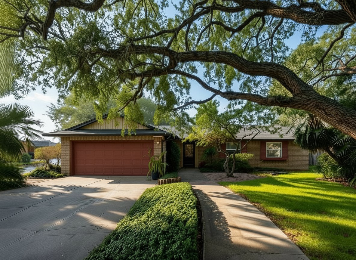 a serene suburban house nestled under lush greenery featuring a charming rustic atmosphere the house exterior is a warm beige brick with a roof in muted charcoal gray the garage door stands out in sherwinwillams limestone the driveway and walkway are a smooth light gray concrete decorative plants and vibrant green grass create a lively garden setting while the overall atmosphere is peaceful and inviting with dappled sunlight filtering through the dense overhanging branches of a majestic tree above