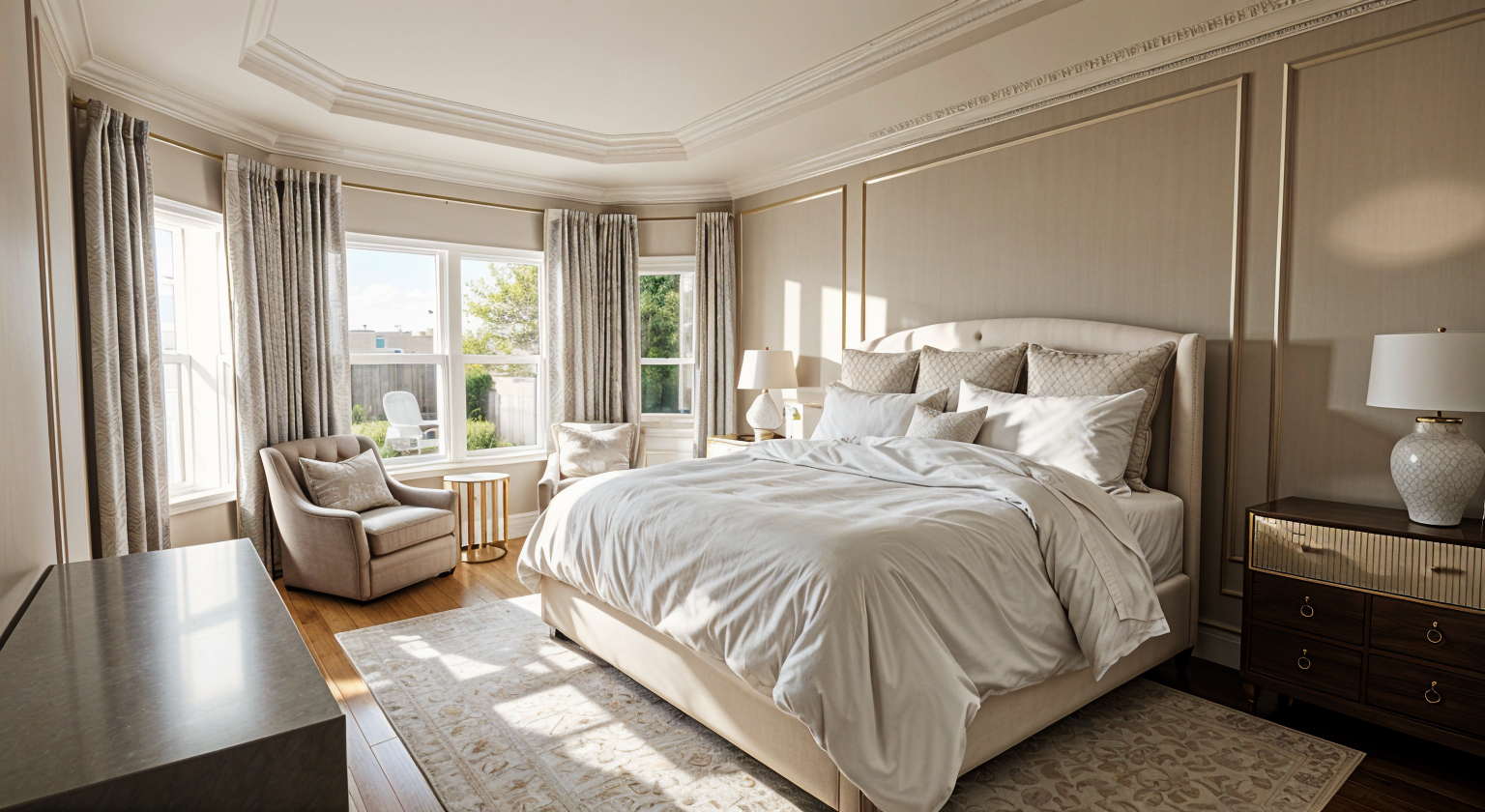 modernist interior shot render an interior scene featuring an unfinished rustic room with high ceilings and exposed wooden beams the space has two elegant archways made of warm terracotta bricks the staircase is made of rich oak wood with a sleek iron railing use soft earthy tones for the walls like a muted cream and highlight the wooden elements with deep chestnut and mahogany hues the atmosphere is serene and timeless with soft natural lighting filtering in through large windows the floor is tiled in a subtle terracotta pattern adding warmth and charm to the space architecture