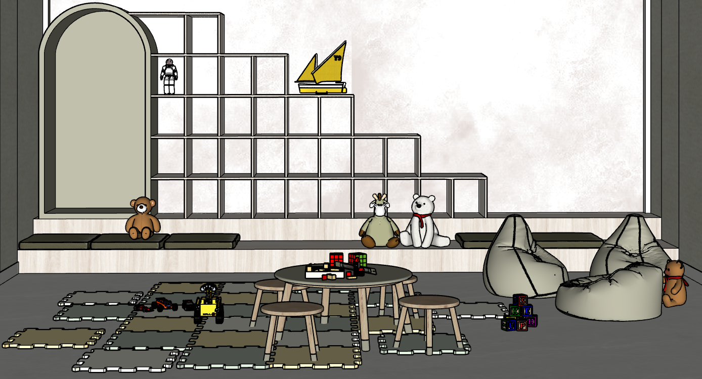 certainly here is a prompt you can use for an ai image generator a cozy children s playroom featuring a minimalist design the room has a soft neutral color palette with a light green wall the play area includes sleek light wooden shelves arranged in a geometric pattern with a playful assortment of toys a yellow toy boat a classic brown teddy bear and other plush animals a small wooden table with matching stools sits atop interlocking foam mats in hues of muted green comfortable beige bean bags rest on the floor providing a relaxed seating area the atmosphere is warm and inviting with soft natural light filtering in creating a soothing and playful environment this prompt attempts to capture the scene s details and atmosphere to help ensure a beautiful rendering
