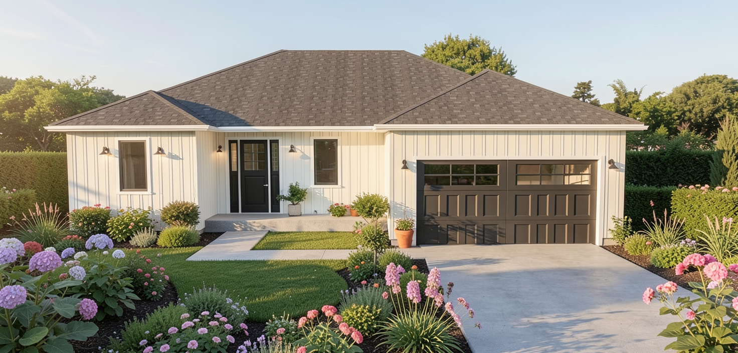 light creamy yellow brick white trim and windows exposed vaulted wood porch ceiling white posts light teal inset front door dark composite decking
