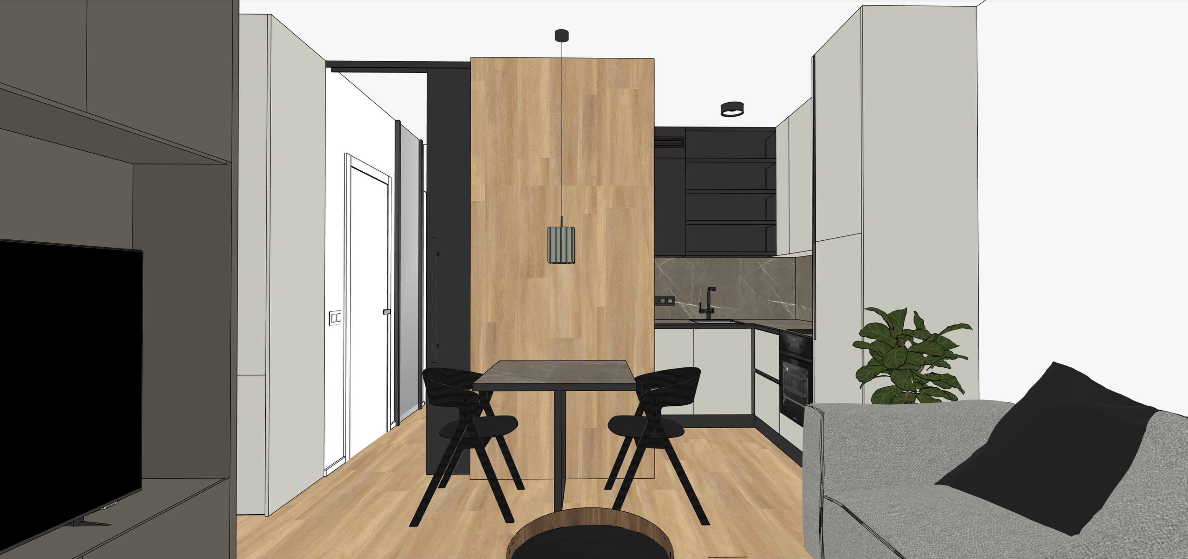 kitchen with dining corner modern style daylight with soft shadows kitchen cabinets in matt grey beige and anthracite finish