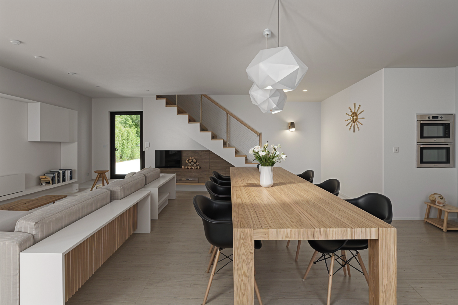 modernist exterior shot add a fire pit in the grass with two muskoka chairs around it keep the grass and no pool do not change the colour of the structure architecture