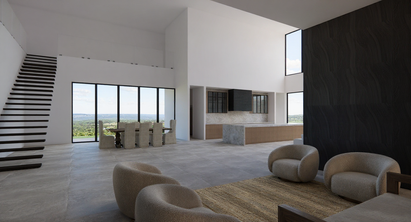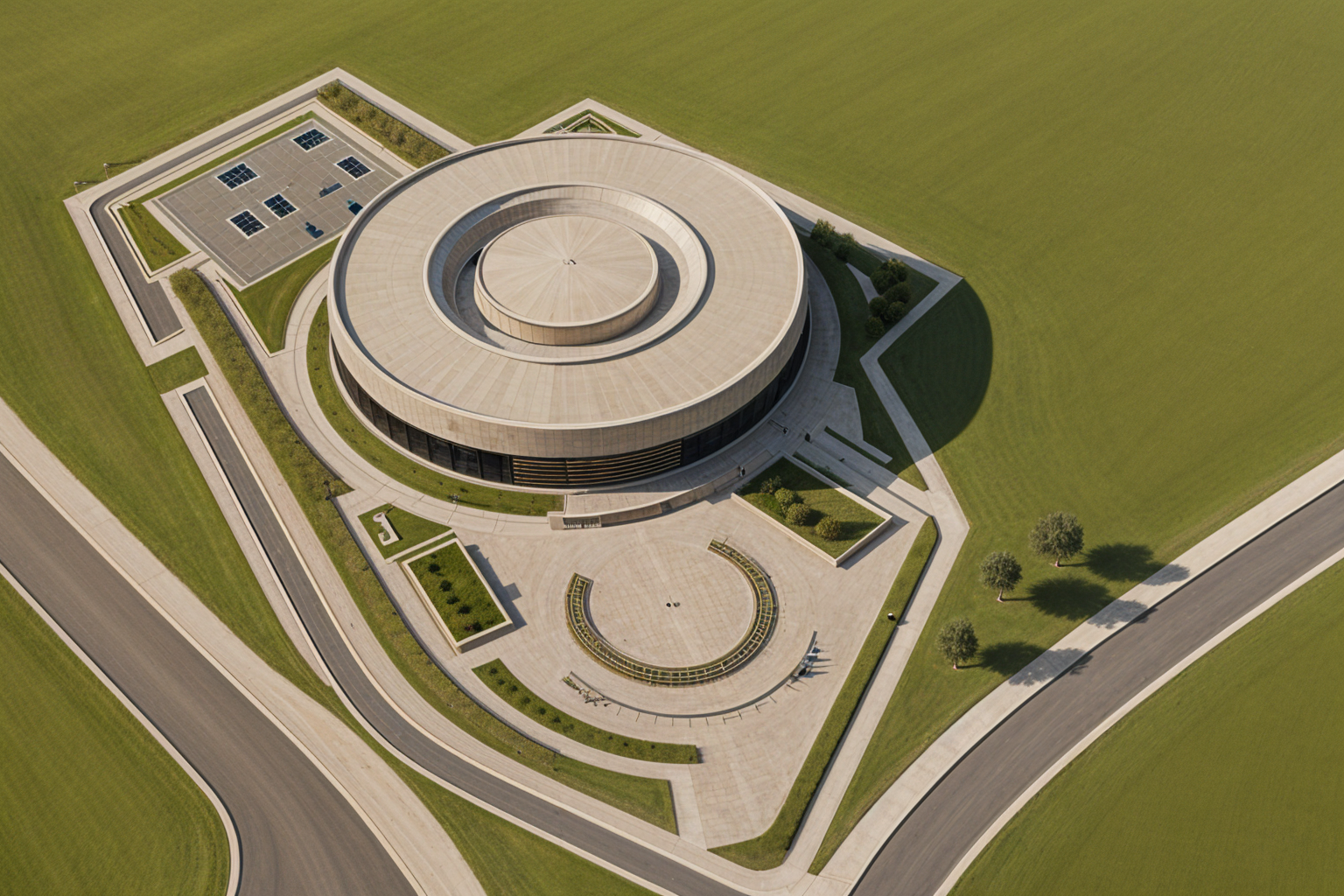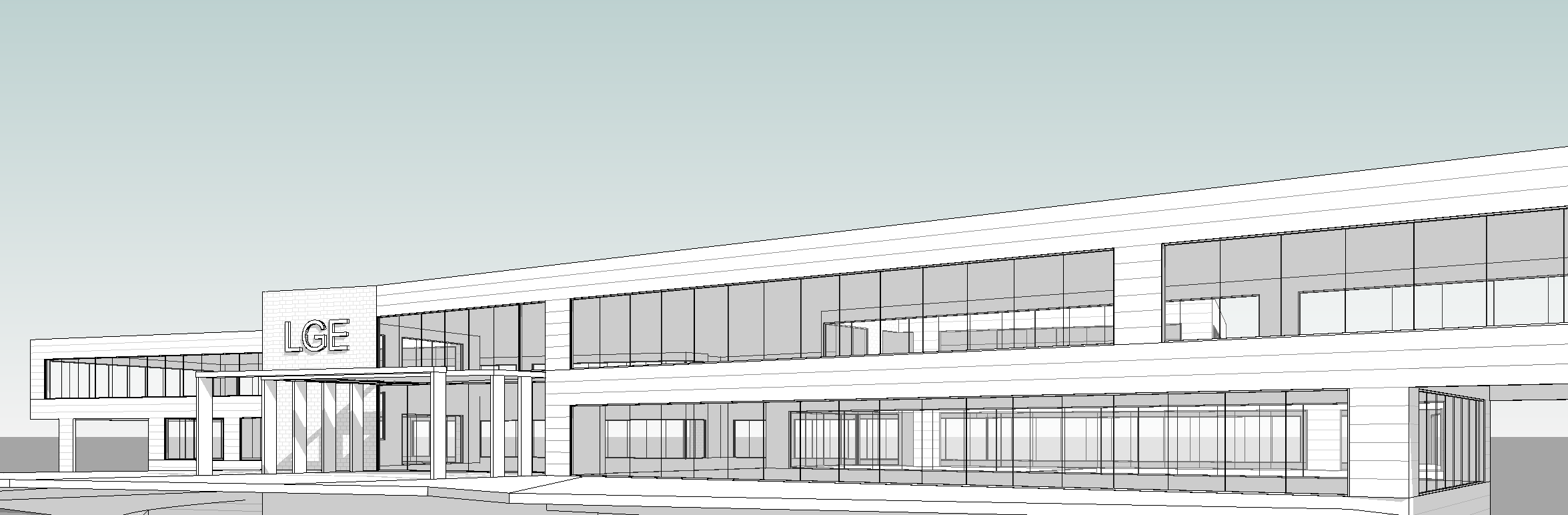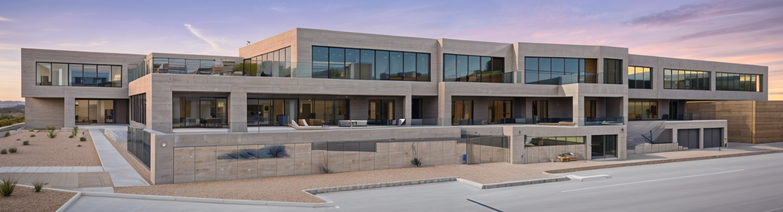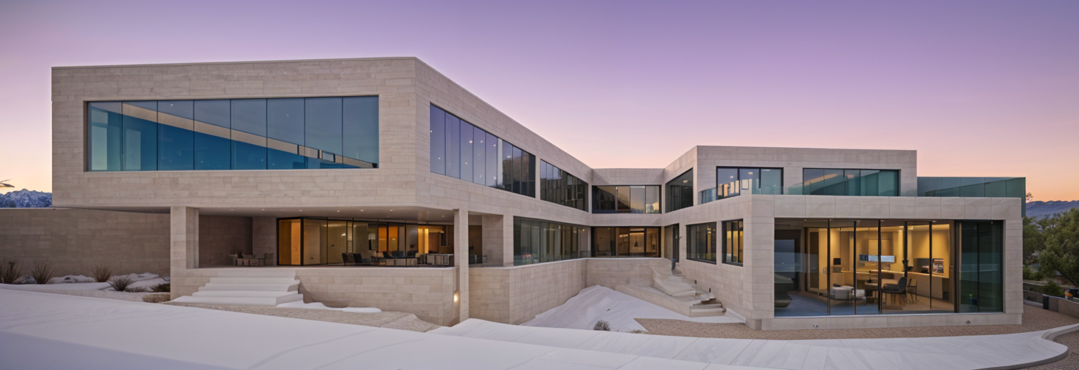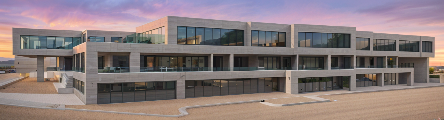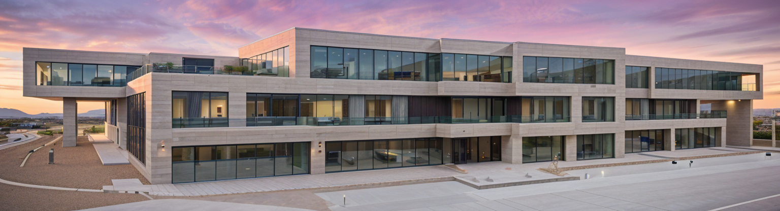 minimalism exterior shot warm desert modern office building in cedar city utah with sandstone cladding and a sunrise sky add people and landscaping to the exterior architecture