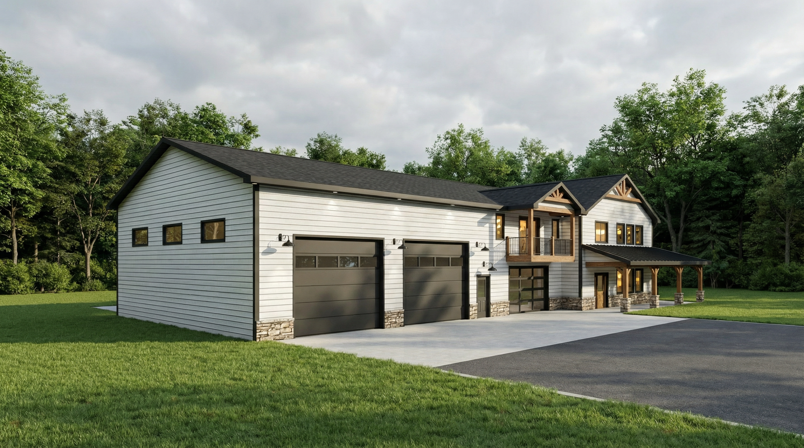 off white hardie charcoal trim with black shingles warm light with trees in background