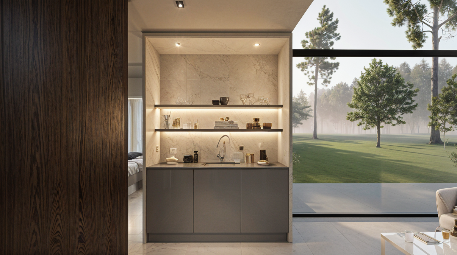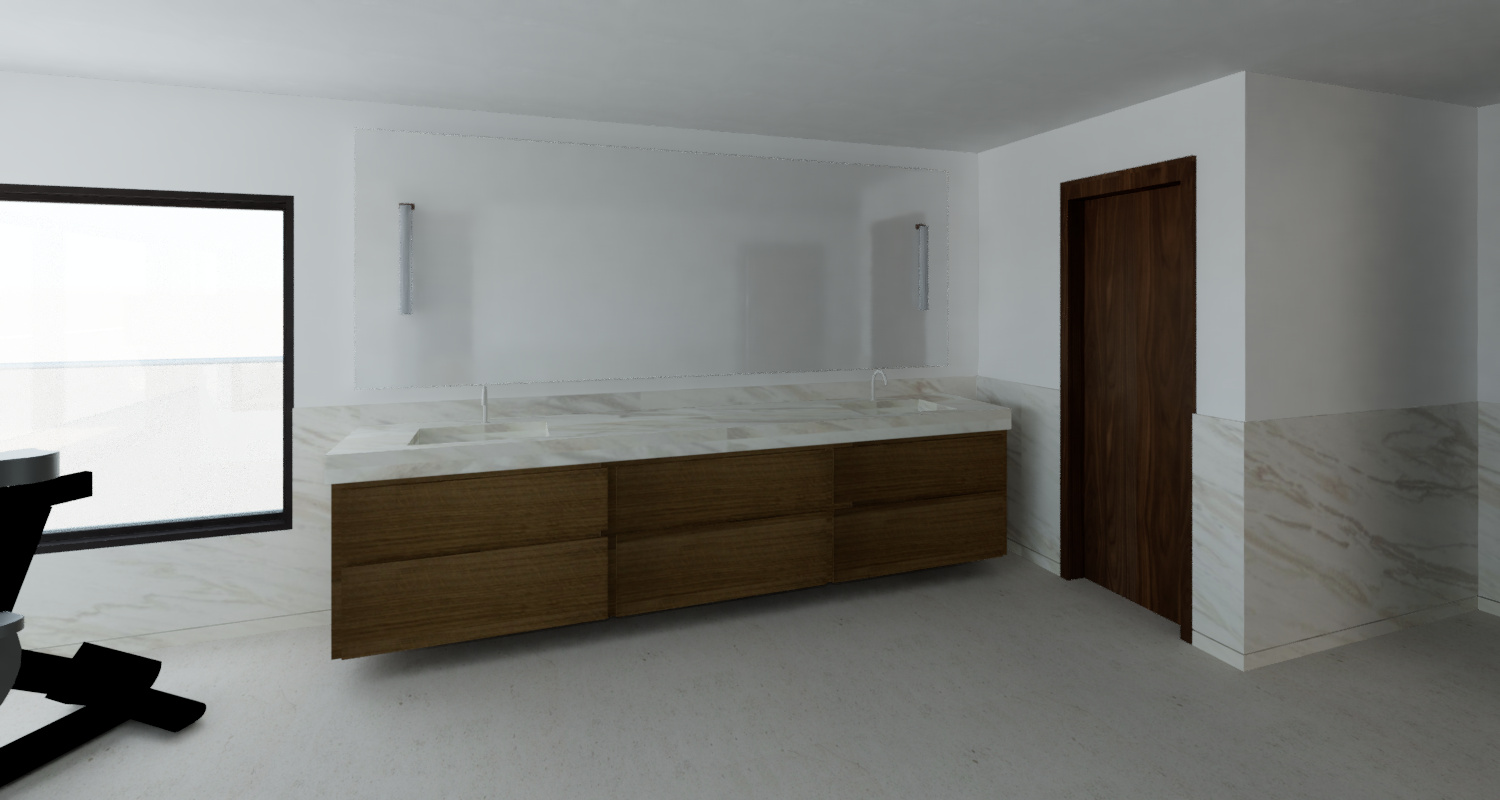 add an ocean view out the windows white marble has soft veins and a hint of blues and golden tones add soft ambient lighting