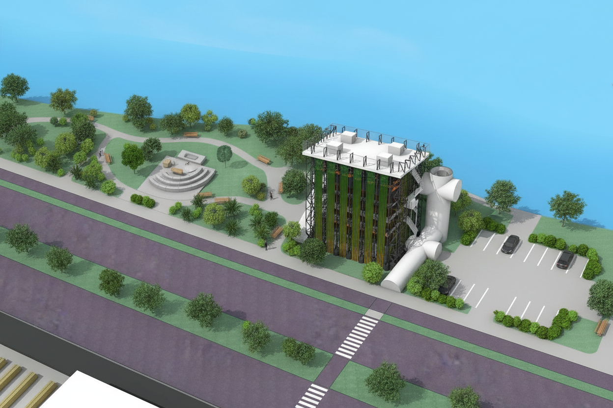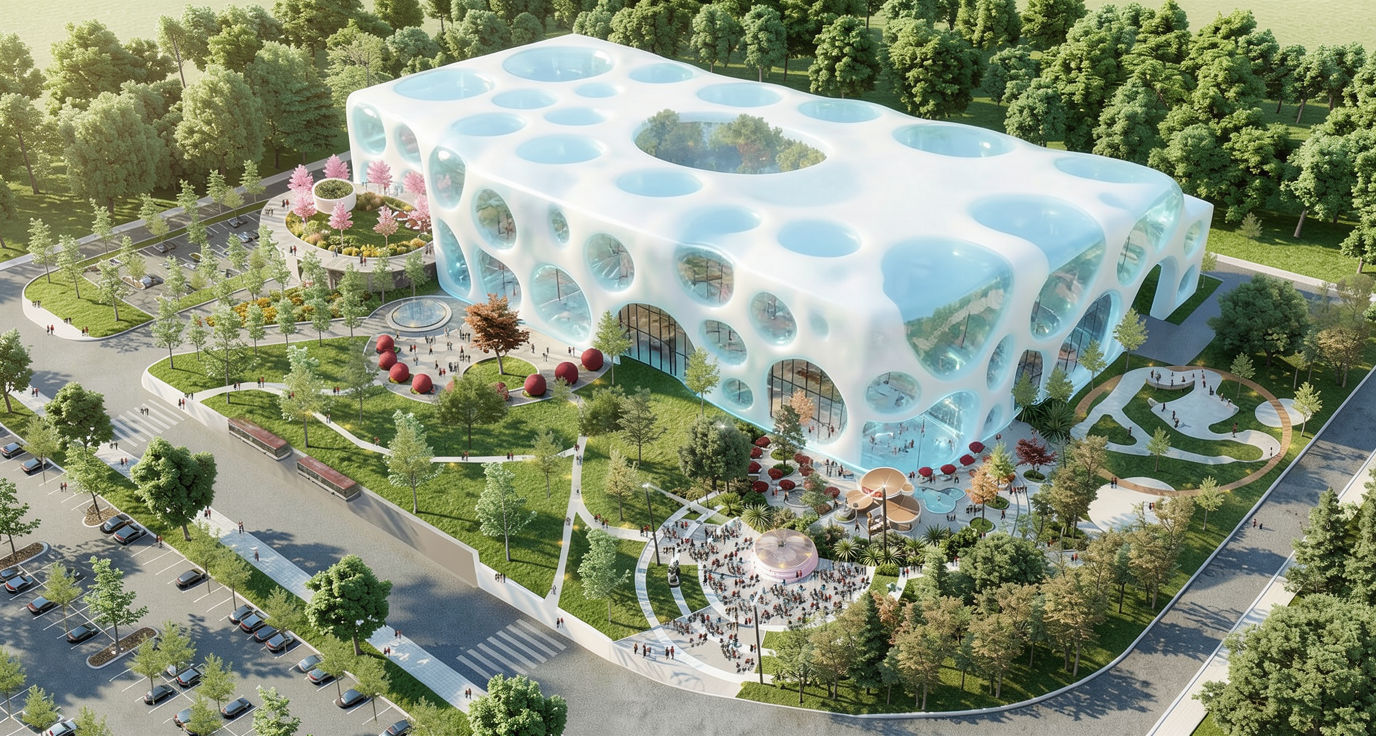 a high resolution architectural render of a large public building featuring a soft translucent bubble fa ade wrapping the entire volume retain the context surrounding landscape and outdoor setting the building mass is a simple solid rectangular prism with slightly softened edges and corners allowing the bubble geometry to flow continuously across all faces including corners no sharp rigid edges the fa ade consists of irregular organic dense foam like cells with varying sizes appearing inflated and seamlessly connected creating a natural fluid pattern across the surface material is translucent with subtle reflections light diffusion and internal glow allowing light to pass through realistically the ground floor is recessed creating a shadow gap so the building appears to float above a transparent base similar to the water cube the recessed level includes glass curtain walls the fa ade begins above this recessed plinth level remove all excess circular perforations the roof is flat no domes and no skylights integrated cleanly into the bubble system maintain a balance between solid mass and selective voids surroundings include a landscaped public plaza soft greenery pathways and people for scale style highly realistic architectural visualization clean minimal contemporary parametric design language