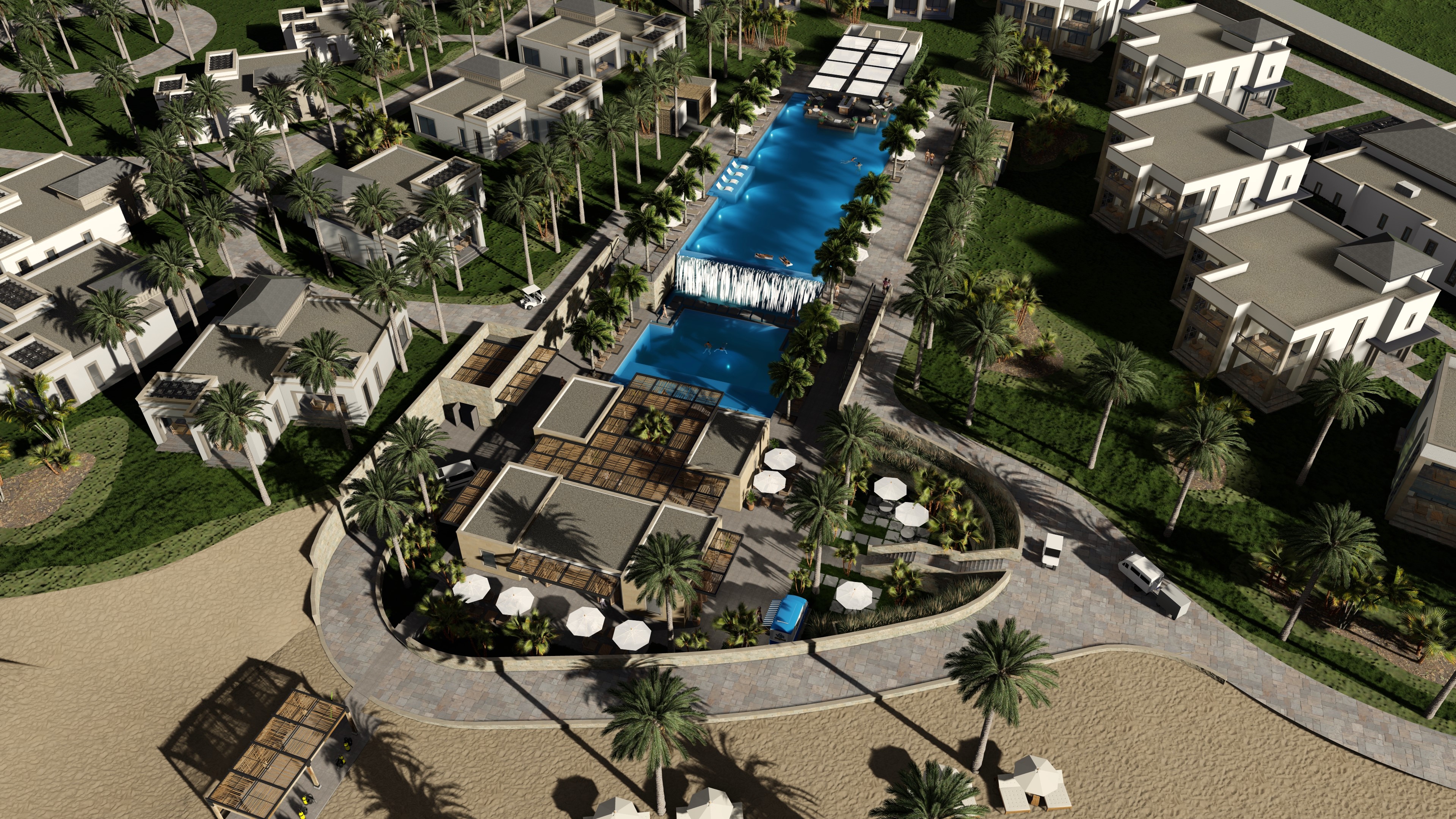make the waterfall effect look more realistic and calm enhance the materials and landscaping make the palm trees look more realistic make the pool water look more realistic and properly scaled