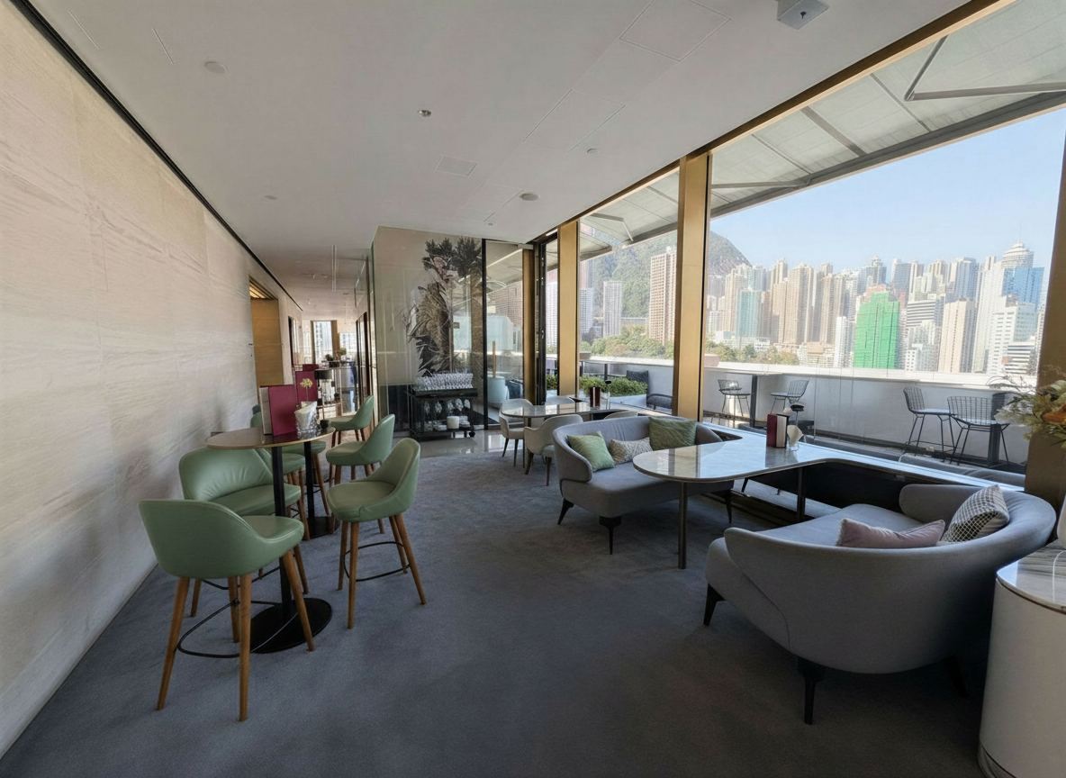 a dark immersive stage environment with an oversized suspended led screens add business people in smart casual work clothing in the audience