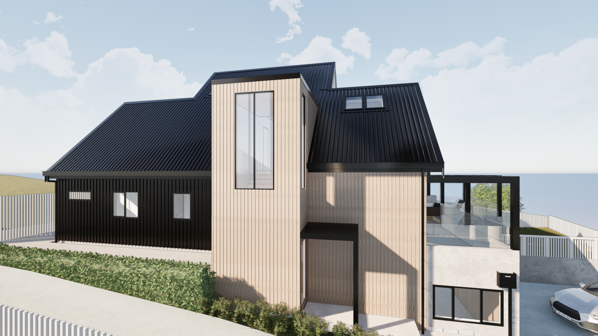 enhance add small neighbouring houses new zealand black trapezoidal metal light oak smooth concrete