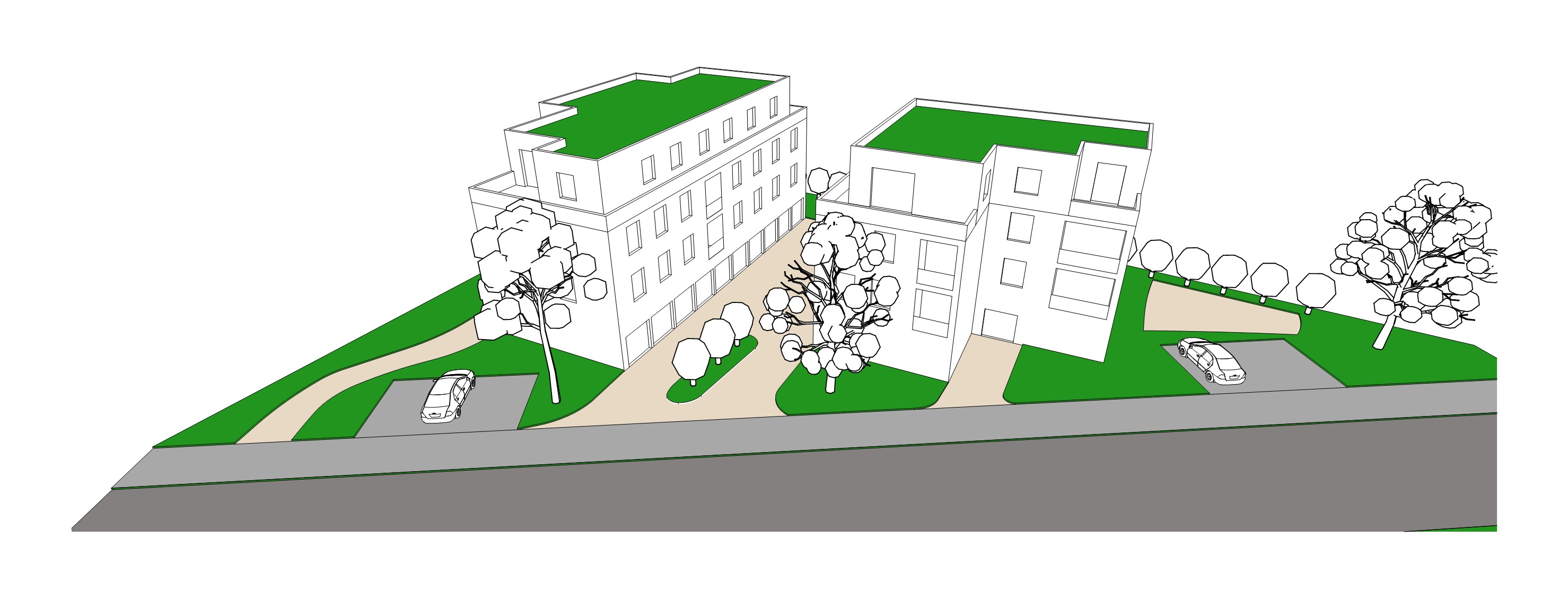 vorne stra e b rgersteig stellpl tze f r autos einfahrt zu garagen im erdgeschoss gr nfl chen dazwischen rechts neben geb ude spielplatz geb ude weisser anstrich fenster leicht begr ntes dach loggien als einschnitte dachterassen beim staffelgeschoss umgebung st dtisch