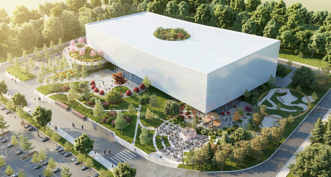retain the context surrounding landscape and outdoor setting the building mass is a simple rectangular prism with slightly softened edges and corners allowing the geometry to flow continuously across all faces including corners and roof no sharp rigid edges the white fa ade consists of irregular organic foam like cells with varying sizes appearing inflated and seamlessly connected creating a natural fluid pattern across the surface material is translucent etfe in soft white and pale blue tones with subtle reflections light diffusion and internal glow allowing light to pass through realistically the ground floor is recessed creating a shadow gap so the building appears to float above a transparent base similar to the water cube the recessed level includes glass curtain walls the fa ade begins above this recessed plinth level remove all excess circular perforations only keep intentional bold entry voids the ground floor is recessed creating a shadow gap so the building appears to float above a transparent base the recessed level includes glass curtain walls the fa ade begins above this recessed plinth level remove all excess circular perforations remove domes and skylights surroundings include a landscaped public plaza soft greenery pathways and people for scale style highly realistic architectural visualization clean minimal contemporary parametric design language