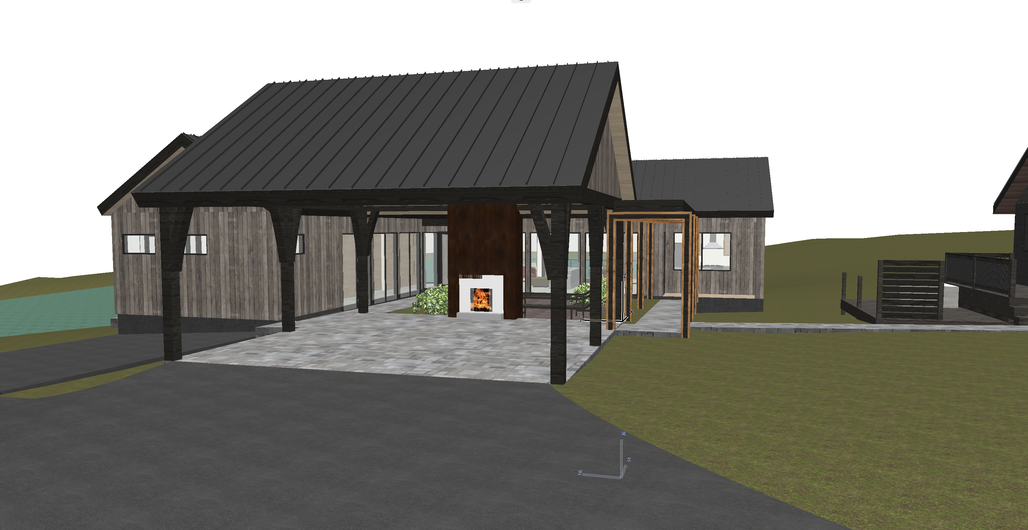 modern farmhouse with covered gathering area in the foreground extensive landscaping with pond to the left distant trees beyond with rolling tree covered hills in the background