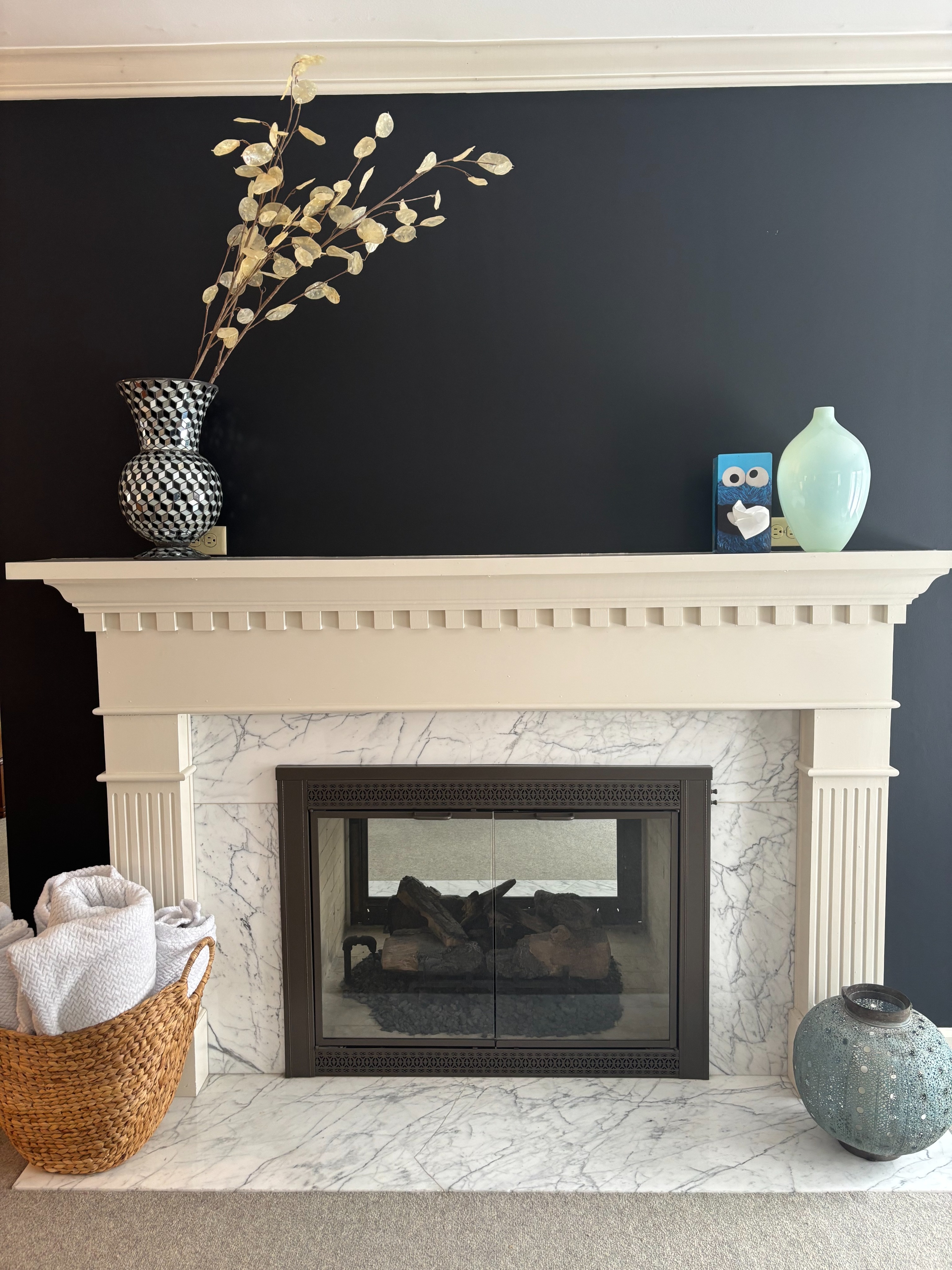 give this fireplace a contemporary refresh i want the walls painted white i want the white marble replaced with charcoal soapstone i want the fireplace surround to be a more contemporary sleek surround made of white oak it can resemble the modern ember fireplace surround that is available at lowe s i want the carpet replaced with a european oak remove the existing decor and replace with some a couple of taper candles on top of the mantel and a piece of vintage pottery add a frame tv above the fireplace