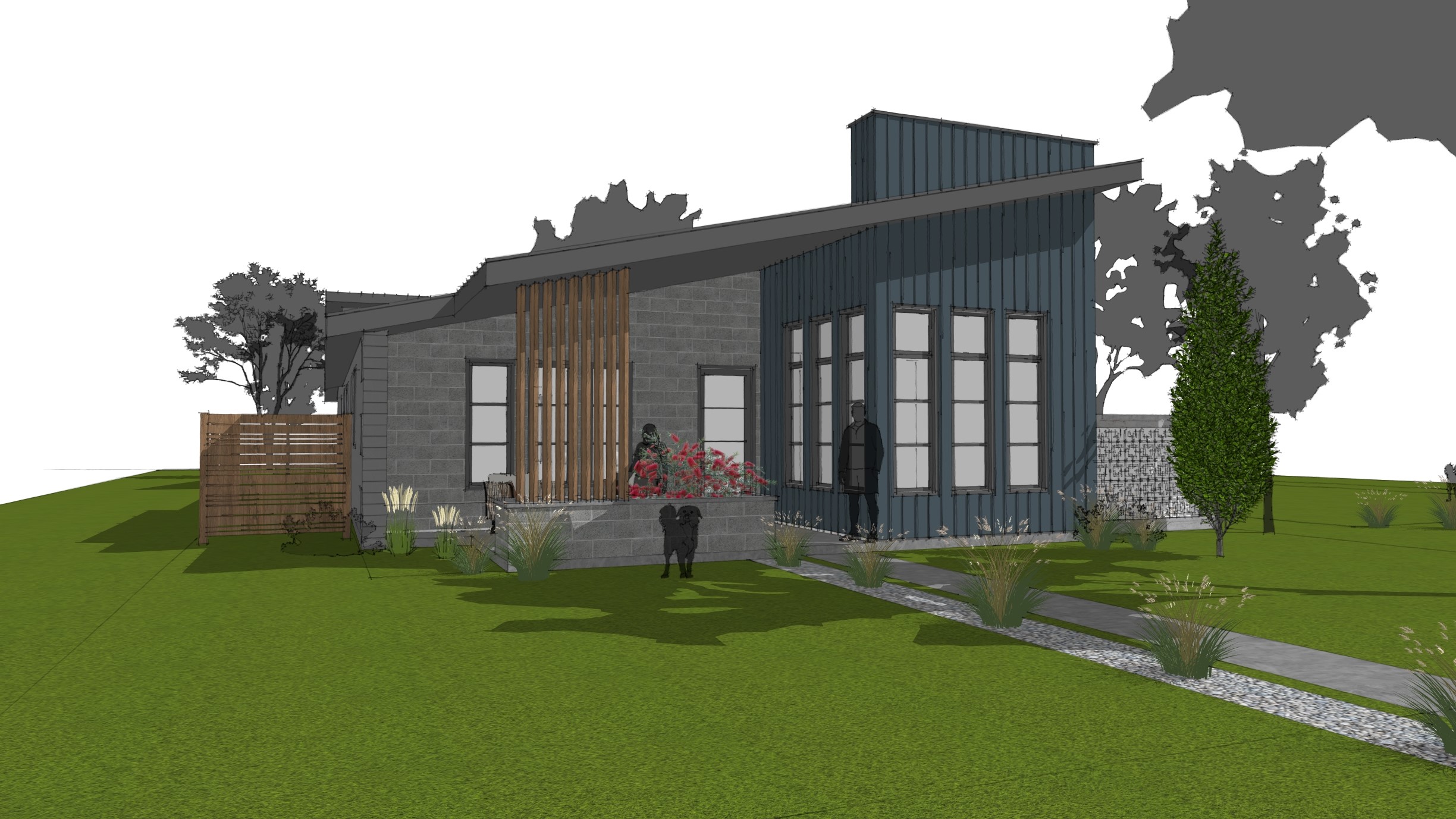 midcentury modern home sunny day keep the structure exactly like it s drawn and follow the color scheme use board and batten use gray split faced concrete blocks add minimal landscaping that you d see in a texas climate