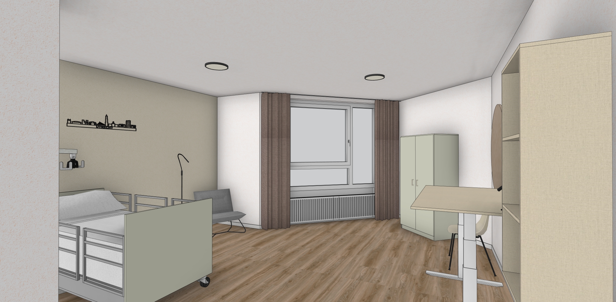 maintain all colors natural daylight ouside small city skyline utrecht schience park turn lights on table top and cabinet are textile beige from egger cabinet in the back and bed ends are sage green from egger make as photorealistic as possible the slightly darker wall is druipsteen from praxis the rest of the walls and ceiling are ral9010