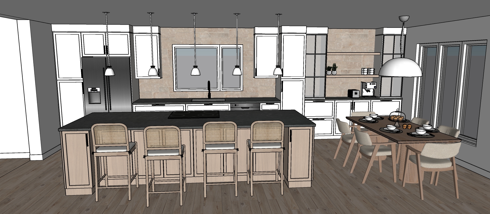 country kitchen with soft daylight lighting featuring the same colors and a view of a winter forest landscape