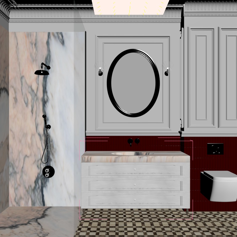 maintain geometry put a beautifyl cristal chandelier where is dark red its ceramic glossiness beautiful marble in the shower keep the same the walls where is white it s like a little bit touch of old decorative effect i want a vintage vibe