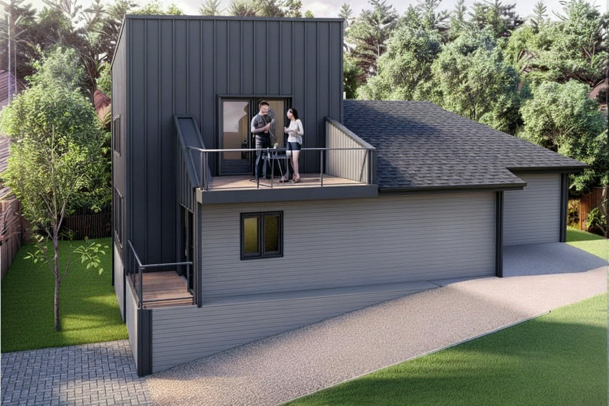 change driveway to light multi tone gray pavers in front of garage door add shrubs in front and curved walkway
