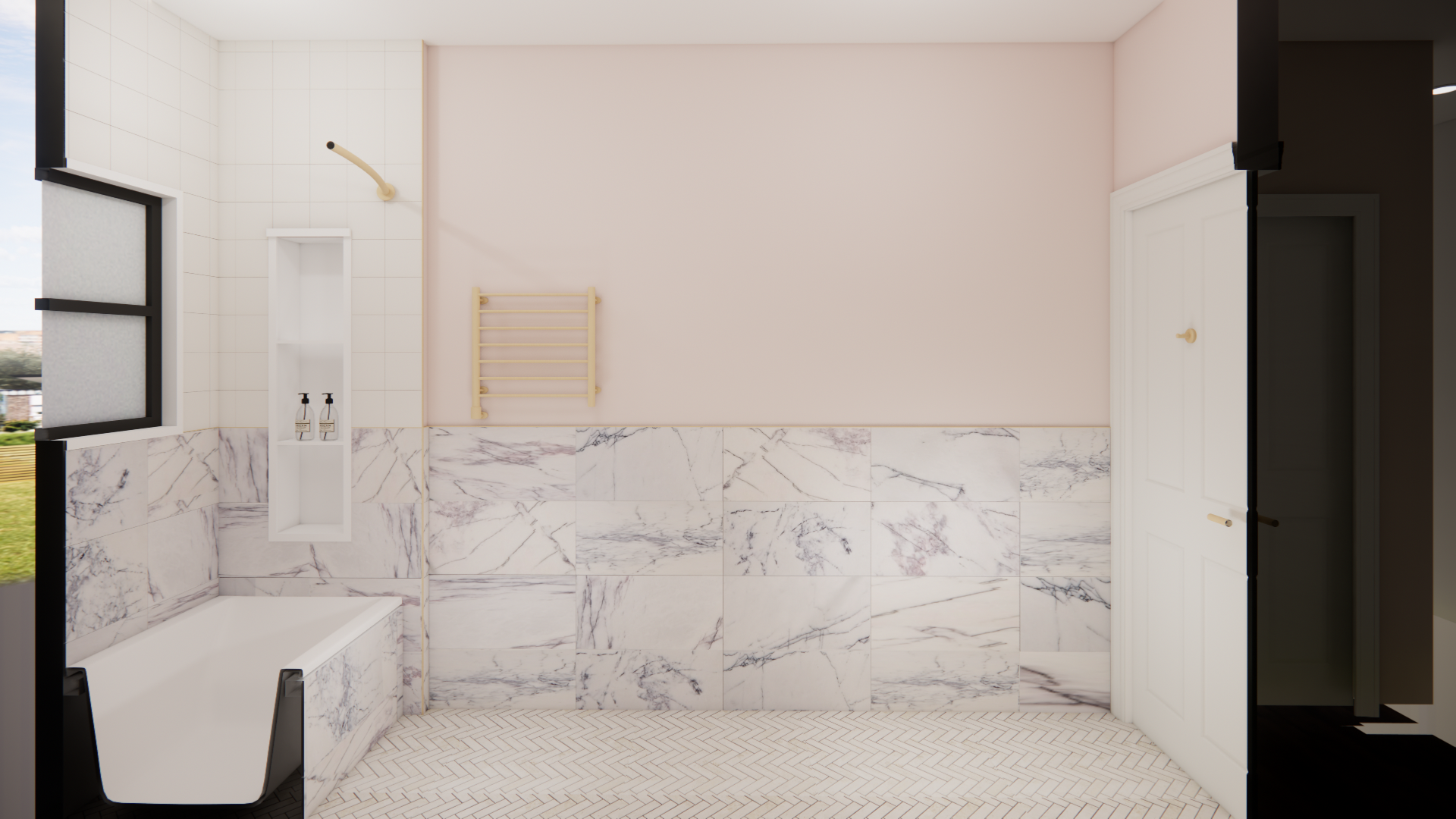 enhance this render to look more realistic improve lighting shadows reflections and material realism but do not add remove or alter any elements objects or materials keep everything exactly the same just make it more photorealistic keep the tile as is keep the brass details