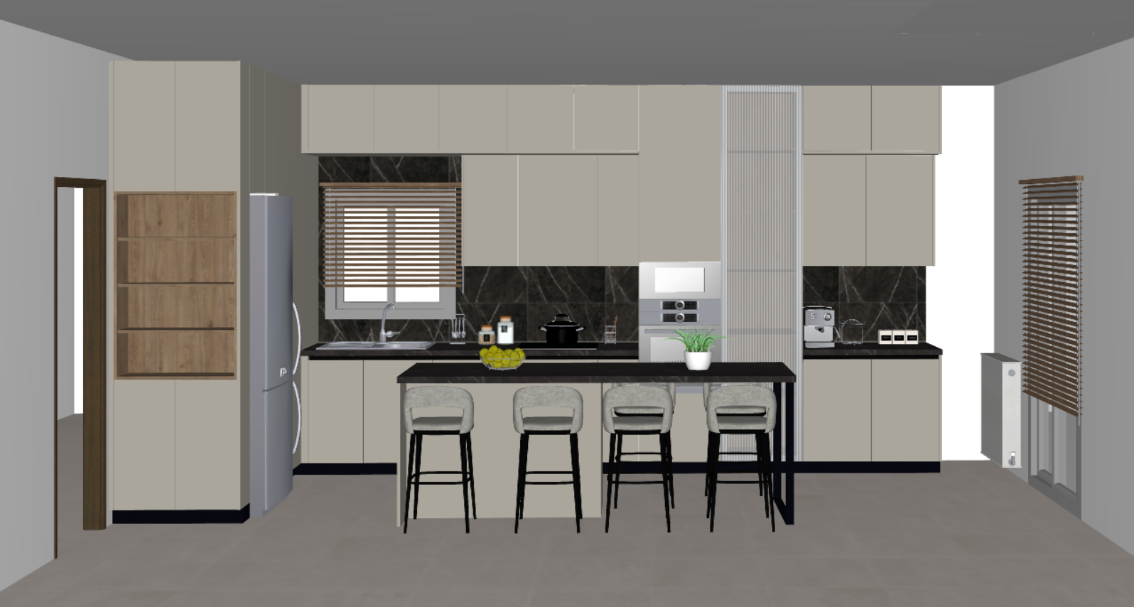a modern kitchen with a sleek minimalist design the cabinets are a smooth beige contrasting with the glossy black marble backsplash the countertops are a deep charcoal complementing the contemporary atmosphere the barstools are upholstered in light gray with elegant black legs and a stainless steel fridge sits to the left wooden blinds on the windows add warmth while the lighting casts a soft inviting glow highlighting the greenery of a small potted plant on the counter creating a soothing sophisticated ambiance