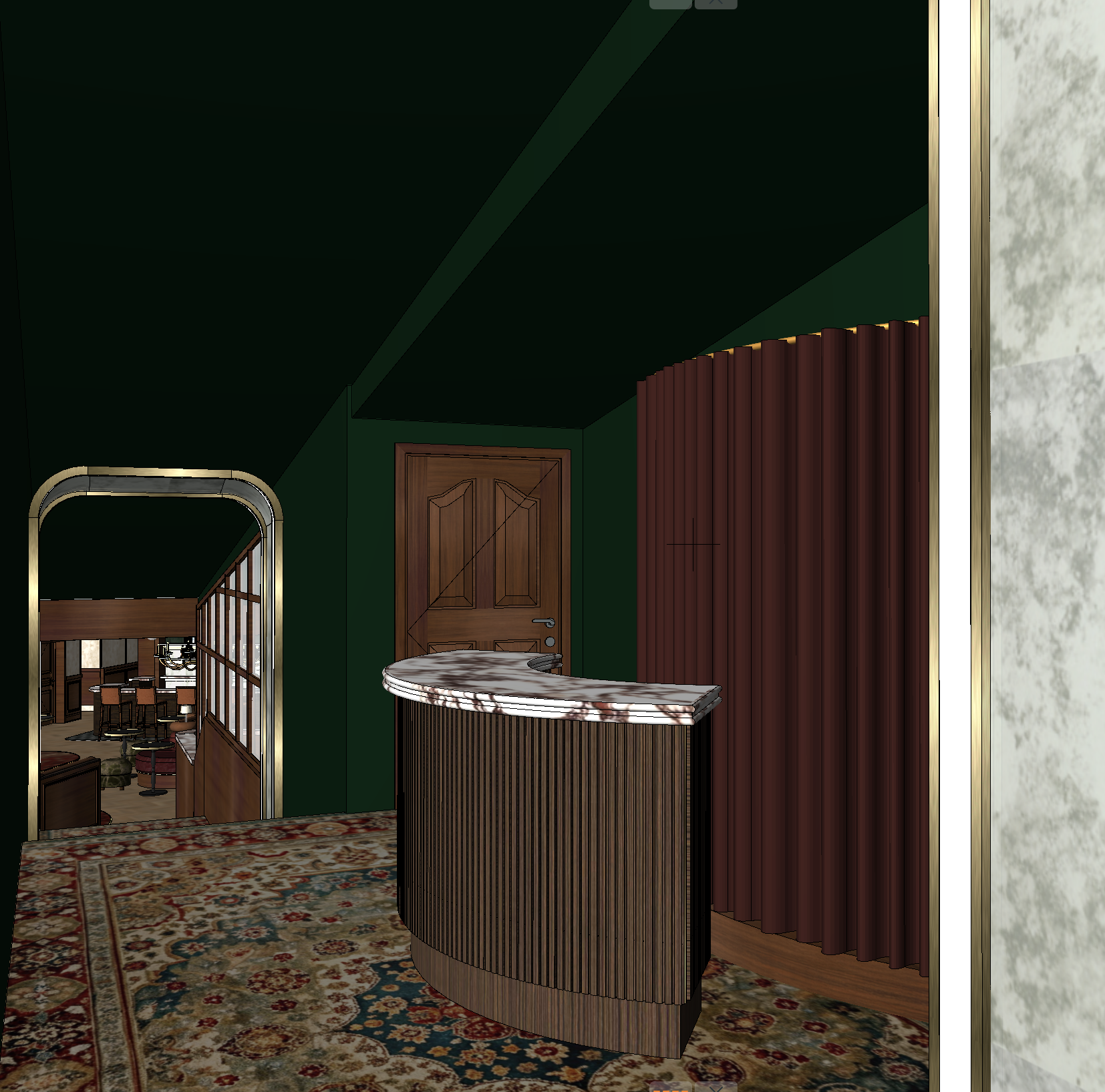 ultra realistic render of the roomservice coat check host area keeping the exact camera angle and geometry rich persian rug on the floor with detailed woven texture curved oak coat check counter with fluted wood base and viola calacatta marble top behind it a dramatic full height burgundy velvet curtain with a subtle sheen heavy folds and luxurious depth used to hide stored clothing walls in deep bottle green tone antique mirror archway with warm integrated led lighting 2700k creating soft reflections and leading the eye toward the illuminated interior of the main dining room lighting should feel warm intimate and atmospheric enhancing the marble veining velvet texture brass trim and carpet pattern no geometry changes only heightened realism crisp materials and inviting hospitality ambiance