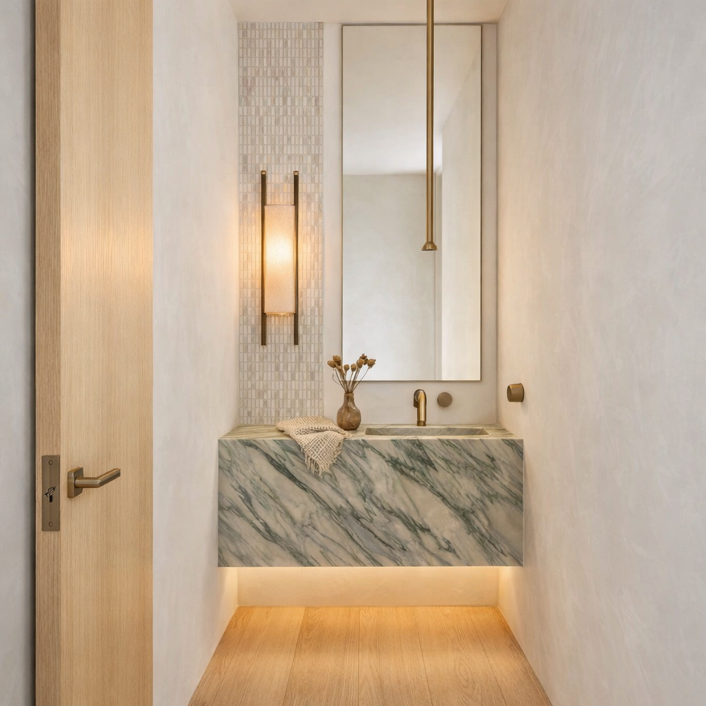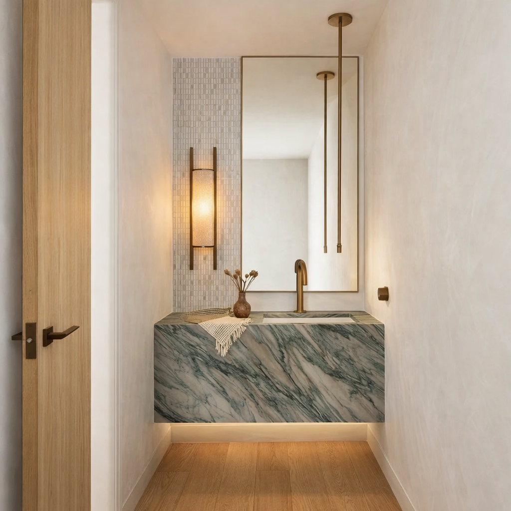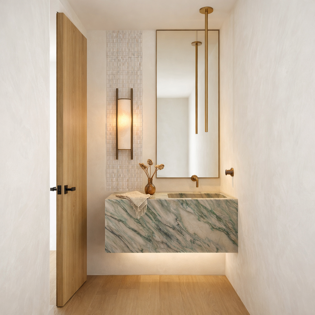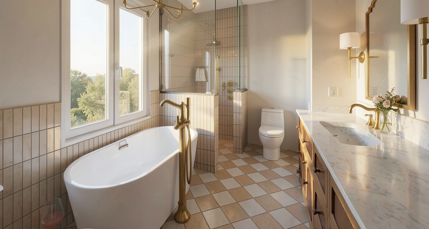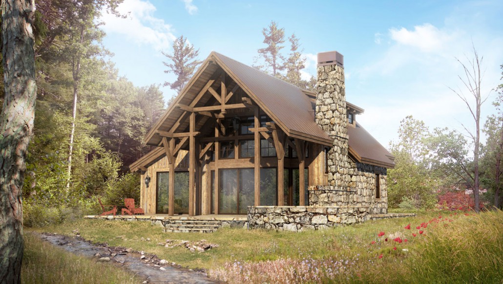 render a rustic cabin in the woods with a stone chimney surrounded by lush greenery the cabin has a wooden structure with a warm brown color for the timber beams and a dark brown roof the stone chimney features a mix of earthy gray and beige hues the scene is set in a tranquil forest with towering green trees and a clear blue sky add a small stream with crystal clear water flowing gently next to the cabin and a patch of vibrant red wildflowers in the grassy foreground the atmosphere is serene and inviting with soft sunlight filtering through the trees