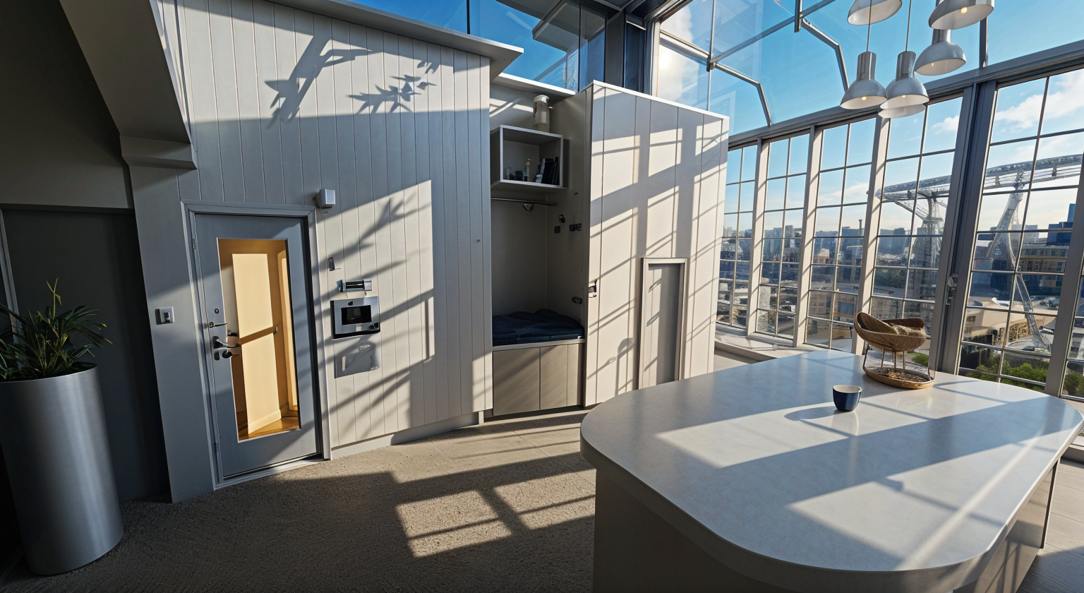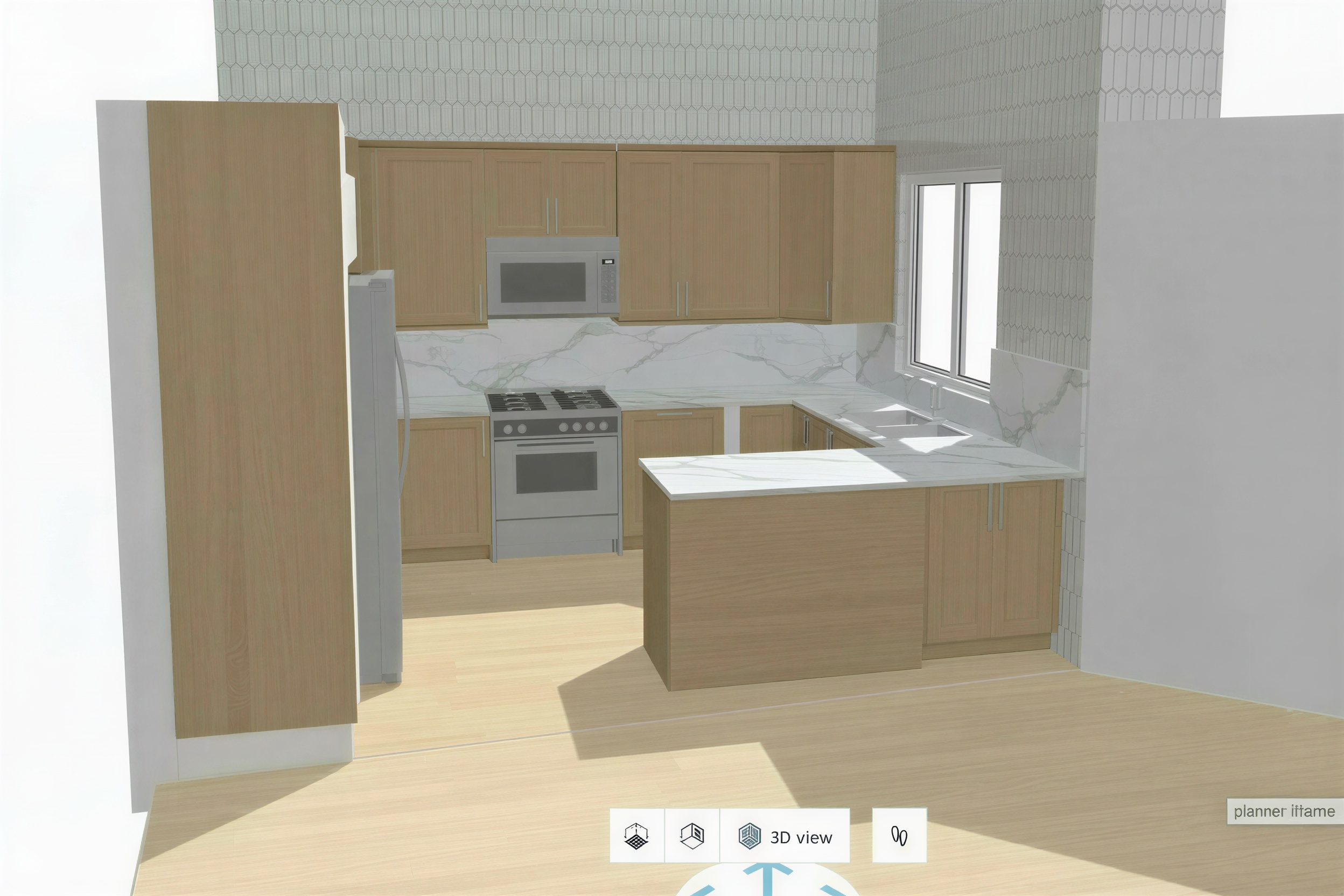 interior shot keep everything the same but change the countertop to hanstone matterhorn and keep the end of the island a consistent line to the wall lighten the wood cabinet color to match https www ikea com ca en p vedhamn door oak 80505157 make the top of the walls and rendering the height of the top of the cabinets and delete the tile and walls above