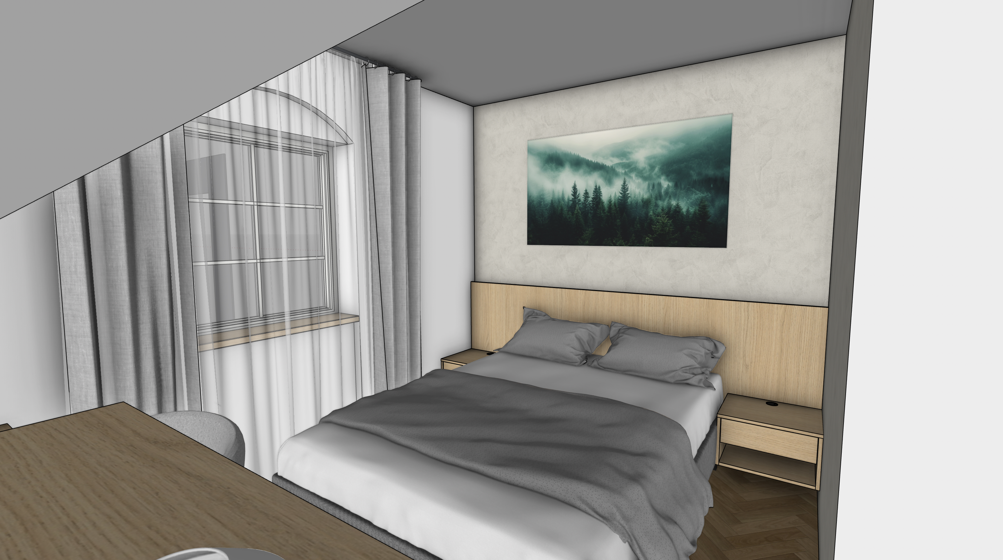 photorealistic render of the uploaded sketchup kitchen image preserve exact camera angle and all original textures materials no redesign add realistic led light behind the bed sunny daylight from outside with global illumination and natural shadows ultra realistic architectural photo ray traced 8k