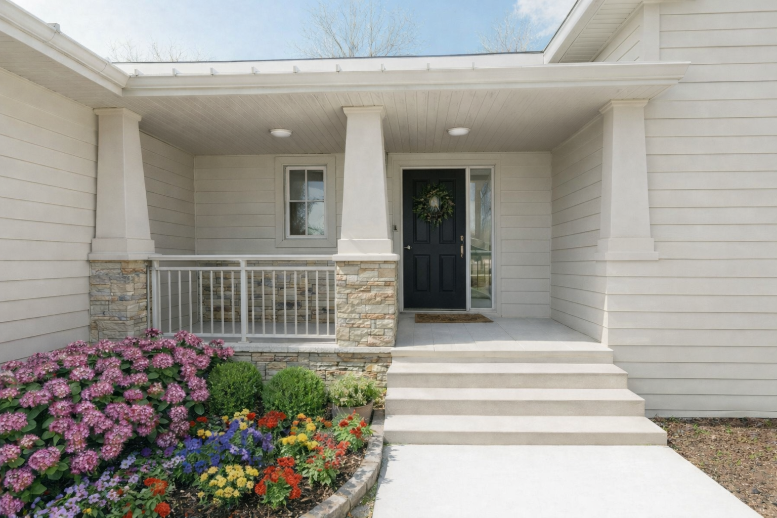 add stone wainscotting on the right side of the porch wrap it around the corner to continue to the edge of the photo make no other changes