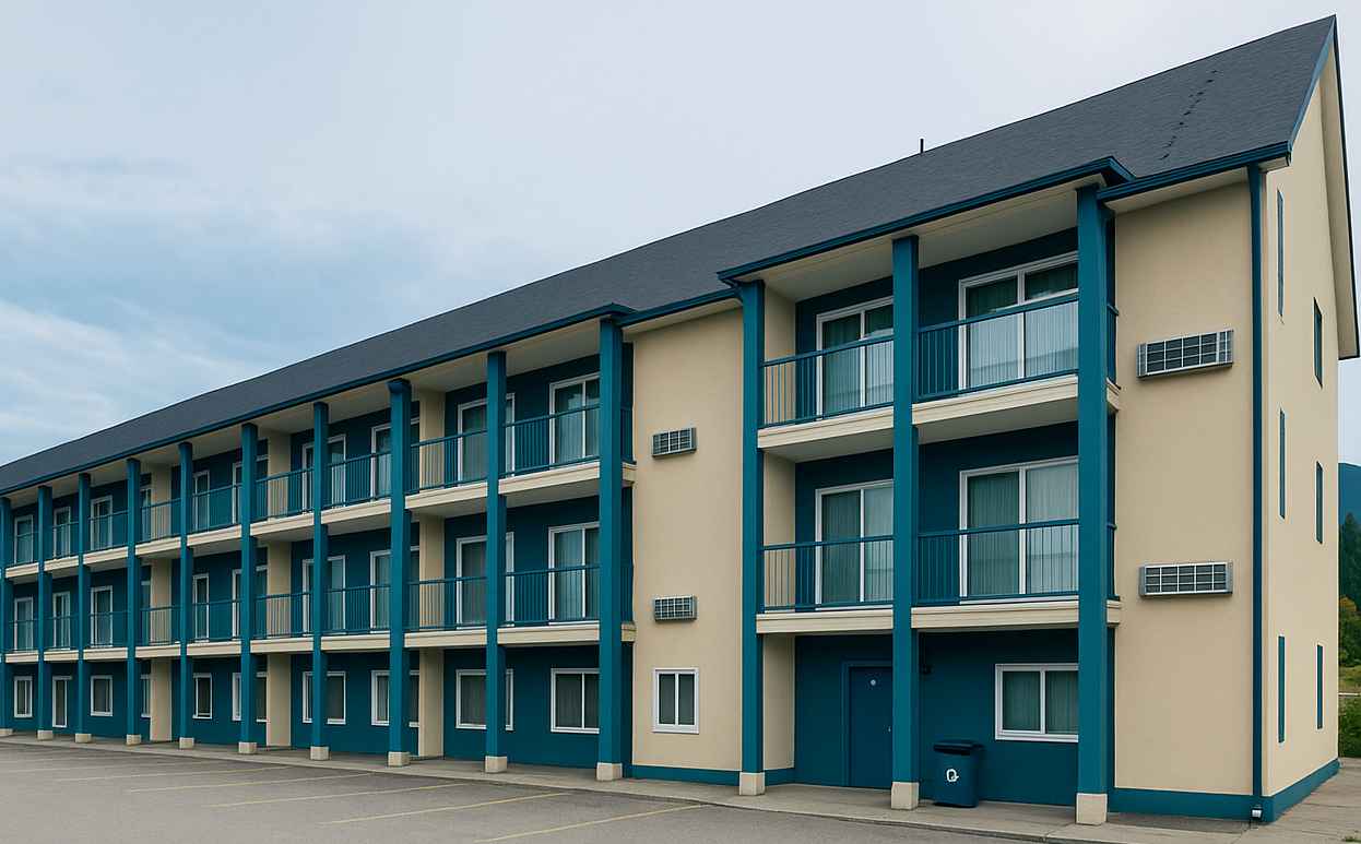 exterior shot 3 story modern apartment building minimalist design beige exterior walls vibrant teal accents on railings and doors large glass windows reflecting a clear sky gray concrete parking lot with yellow lines serene and peaceful atmosphere soft morning light gentle shadows partly cloudy sky with hints of blue