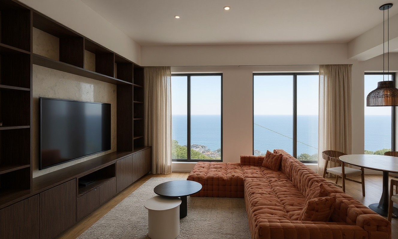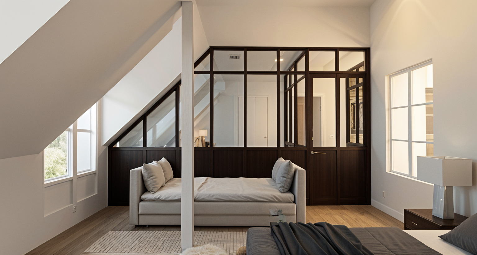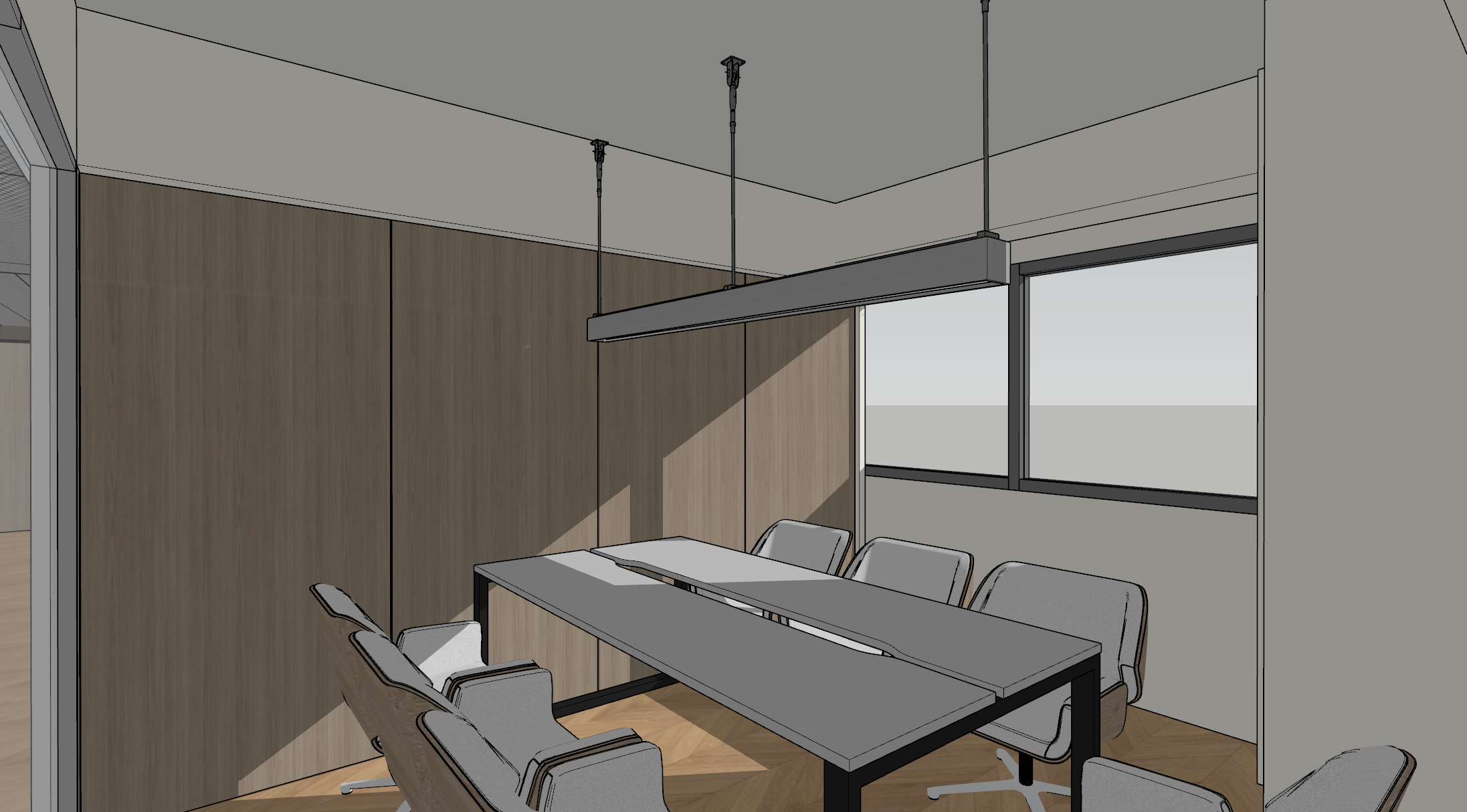 modern office interior with a spacious open plan layout featuring rows of sleek light colored walnut chairs and minimalist white desks set against soft gray walnut walls natural light pours in through large windows creating a bright and airy atmosphere the ceiling is dotted with contemporary linear lighting fixtures adding a touch of elegance the metal frame for the glass gives a white color the floor of the conference room is a slightly darker beige carpet finish maintain the camera angle and scale