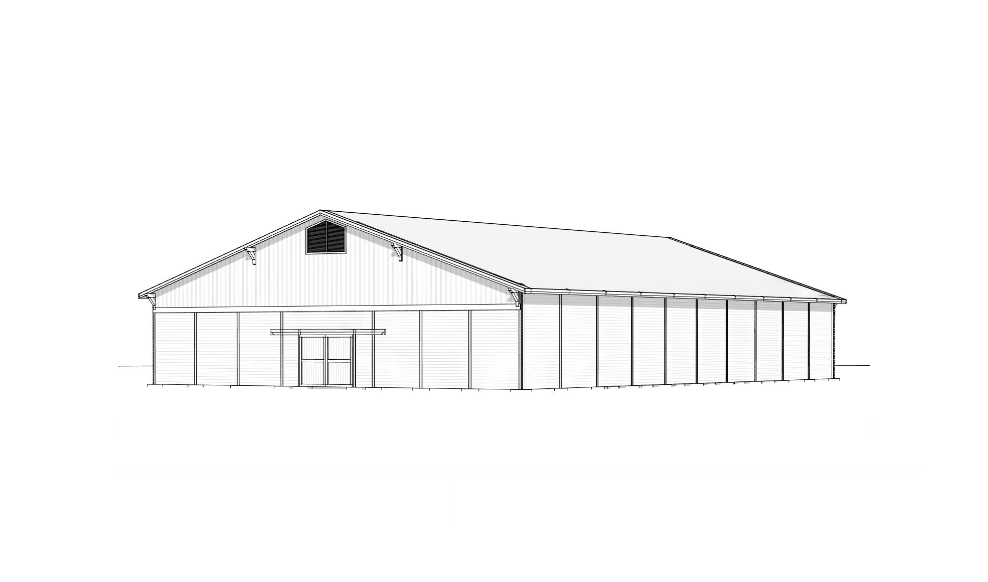 clean equestrian horseback riding arena architectural open air exterior arena rendered in cinematic golden hour lighting with blue skies and vibrant clouds enclosed horse arena in a lush beautiful forest setting with green grass and dense trees surrounding the property select grade horizontal cedar siding on the lower part of the structure and douglas fir board and batten on the upper portion of the arena green manicured landscape around structure with gardens and grass black standing seam metal roof high fidelity photorealistic visualization crisp shadow falloff refined facade geometry soft atmospheric depth premium architectural photography mood ultra clean composition and materials photorealistic render prominent trees scattered around the property black posts black trim around wood barn doors lower and upper sides of the structure have horizontal cedar wood siding
