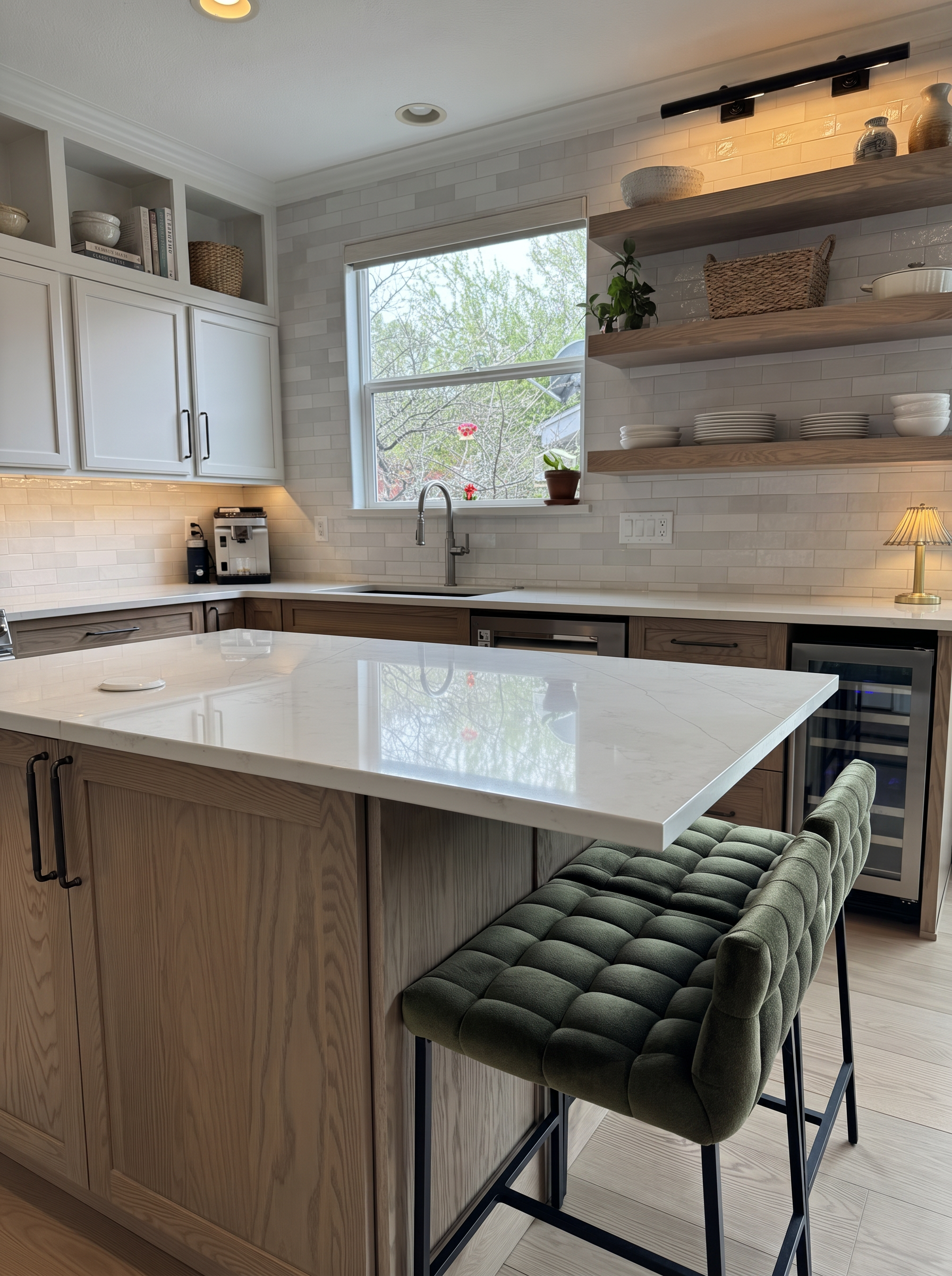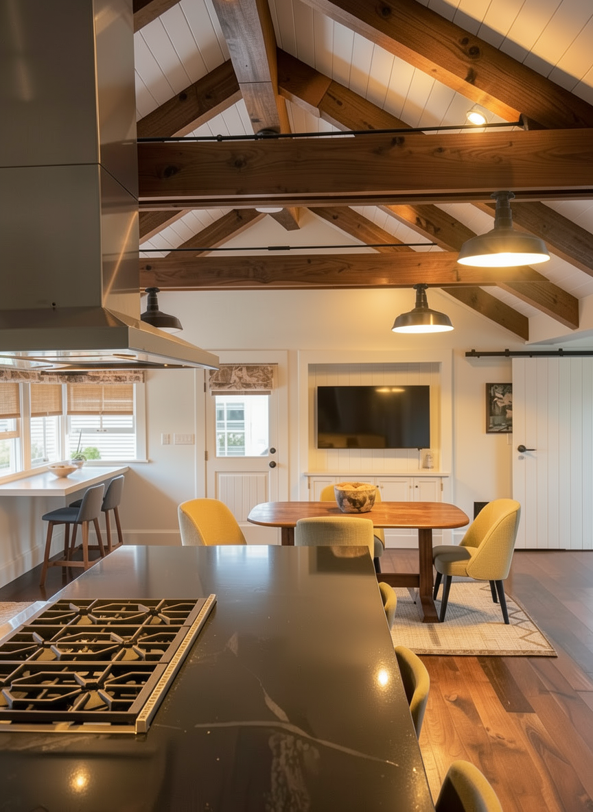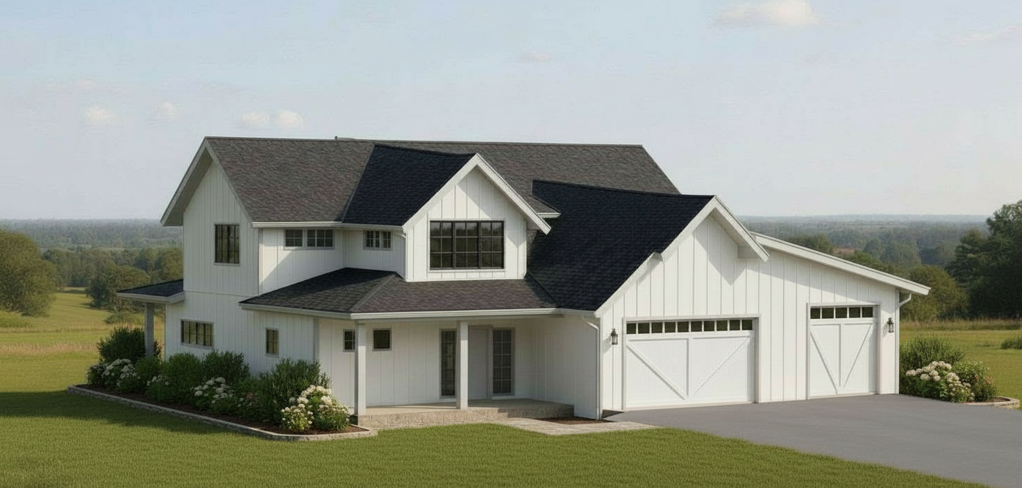 enhance realism and lighting quality only preserve original elevation geometry and composition exactly no redesign materials white horizontal siding with soft warm undertones not stark white black window frames with subtle reflectivity maintain all original window placements and proportions doors convert central rear doors to large sliding glass doors with slim black frames highly transparent glass minimal mullions door on right should match style highly transparent glass slim black frames white door paint steps replace entry steps with light natural stone light bluestone clean edges slightly matte texture lighting soft late afternoon golden hour sunlight warm directional light casting gentle realistic shadows across facade even exposure no harsh contrast subtle ambient sky light slightly warm white balance creamy whites not blue windows soft warm interior glow visible 2700k realistic glass reflections no overexposure rendering style photorealistic high end residential photography natural color grading soft shadows no over saturation no dramatic contrast no stylization environment minimal clean lawn landscaping with soft green foliage and white hydrangeas light bluestone patio that spans length of house