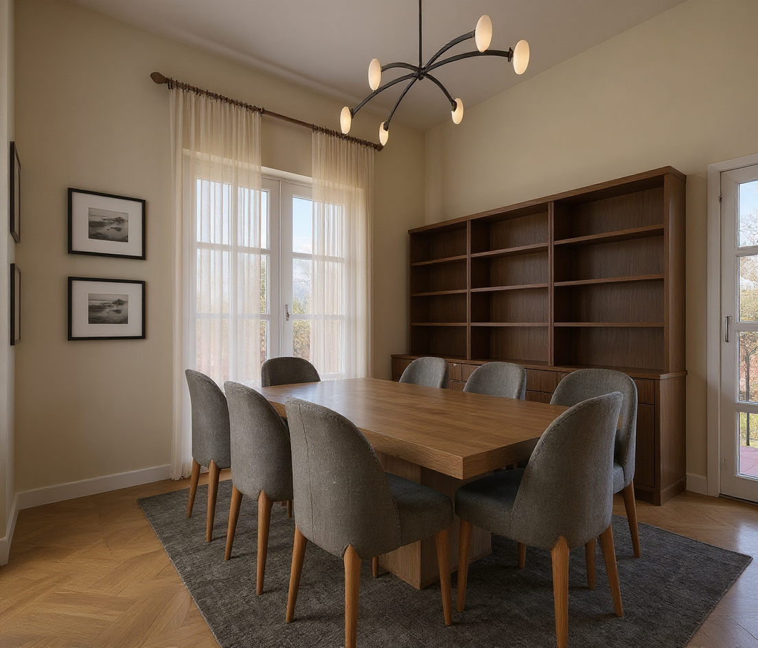 maintain the exact geometry from the sketchup model without any modifications or alterations render all materials exactly as depicted in the original image reference preserving textures colors and finishes without deviation make the materials look as realistic as possible use the lamps shown in the model to create the interior lighting setup ensuring accurate positioning and intensity ensure the overall aesthetic is contemporary emphasizing clean lines modern finishes and balanced lighting