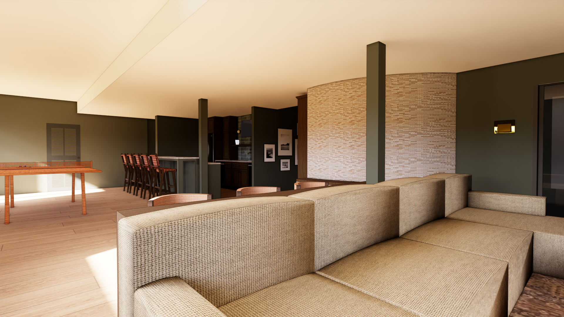 prompt create a photorealistic image of the 3d model attached do not change the colors materials scale or details keep the ceiling the exact same way