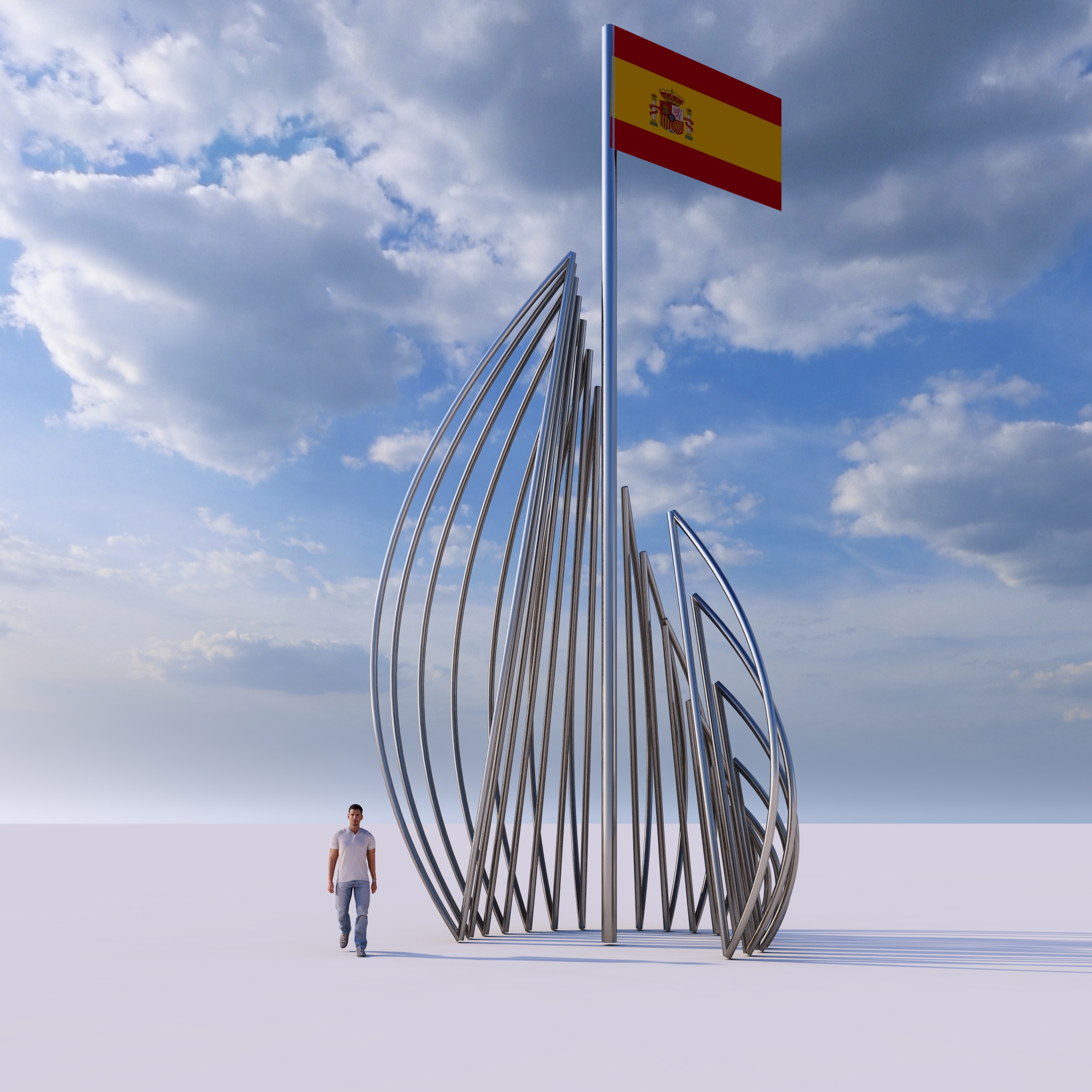 image based reconstruction not generative design exact replication of the reference monument 19 circular metal profiles maximum height 12 meters do not change the design exact geometry from reference image exact geometry from reference image scale instructions include a person in the scene reference human to establish correct proportions the monument must appear realistically 12 meters tall relative to the person do not shrink or exaggerate the monument size maintain true to life scale urban promenade inside the city with wide pedestrian paths benches streetlights and abundant vegetation the monument is a secondary background element wide shot environmental view monument placed off center rule of thirds partially framed by vegetation people trees and promenade activity dominate the scene vegetation dense greenery and palm trees behind and around the monument some vegetation partially overlaps the monument depth and spatial hierarchy foreground pedestrians urban activity promenade elements midground vegetation and urban space background monument integrated within the scene far background distant beach and sea subtle strict constraints no sand in foreground no beach elements near the monument no isolated monument shot no centered composition less vegetation real proportions elimina vegetacion
