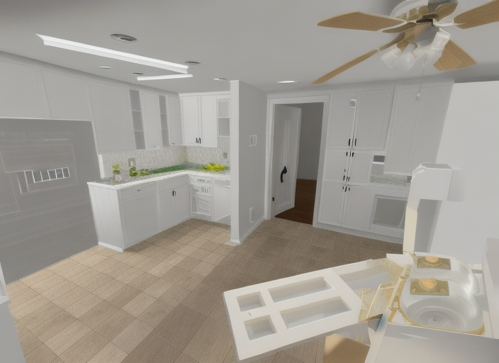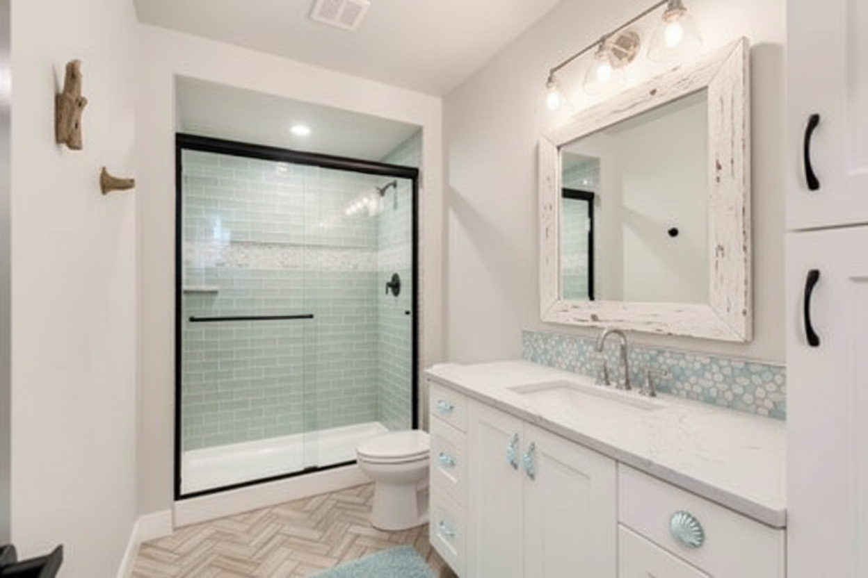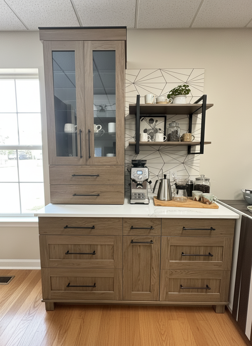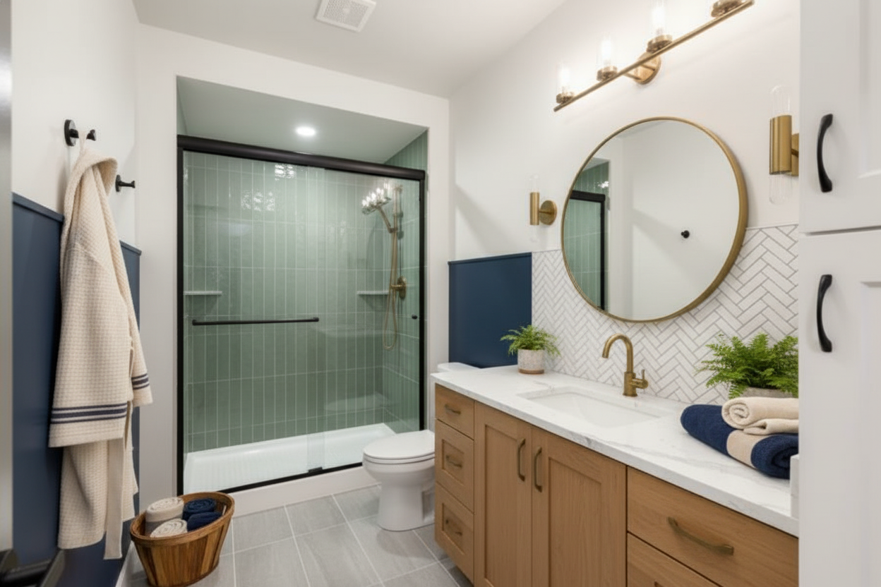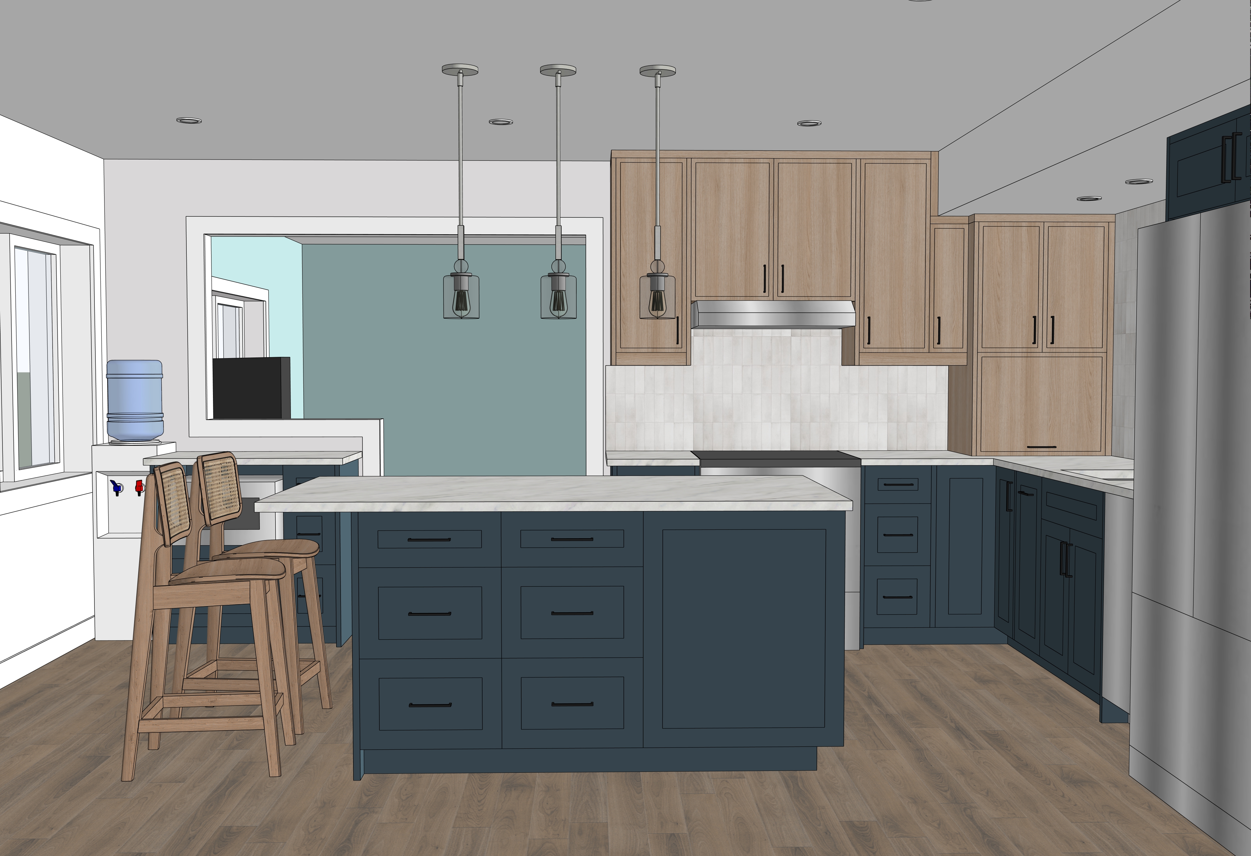 create a realistic image of this kitchen scene in a bright modern style with light coming in from the windows the potlights and pendant lights are lit up the deep teal cabinets have shaker style doors the wood cabinets have flat doors the cabinet handels are brushed nickel include stainless steel appliances add two mugs and a small plate with a croissant on the island next to the stools