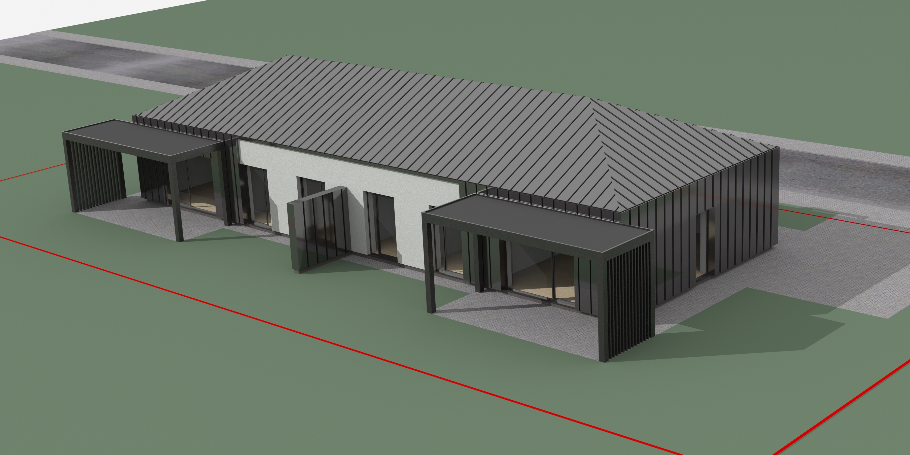 render a modern single story house in a serene suburban setting the building features a distinct angular design with dark grey metallic cladding and geometric lines highlight a sleek grey metal roof with sharp textures the main facade includes a soft light grey plaster wall with minimalist rectangular windows capture an overcast atmosphere enhancing the muted tones and emphasizing the clean architectural lines incorporate a well maintained sidewalk in subtle light grey paving and a neatly trimmed grassy area surrounding the structure change red line to dark grey metal wire fence