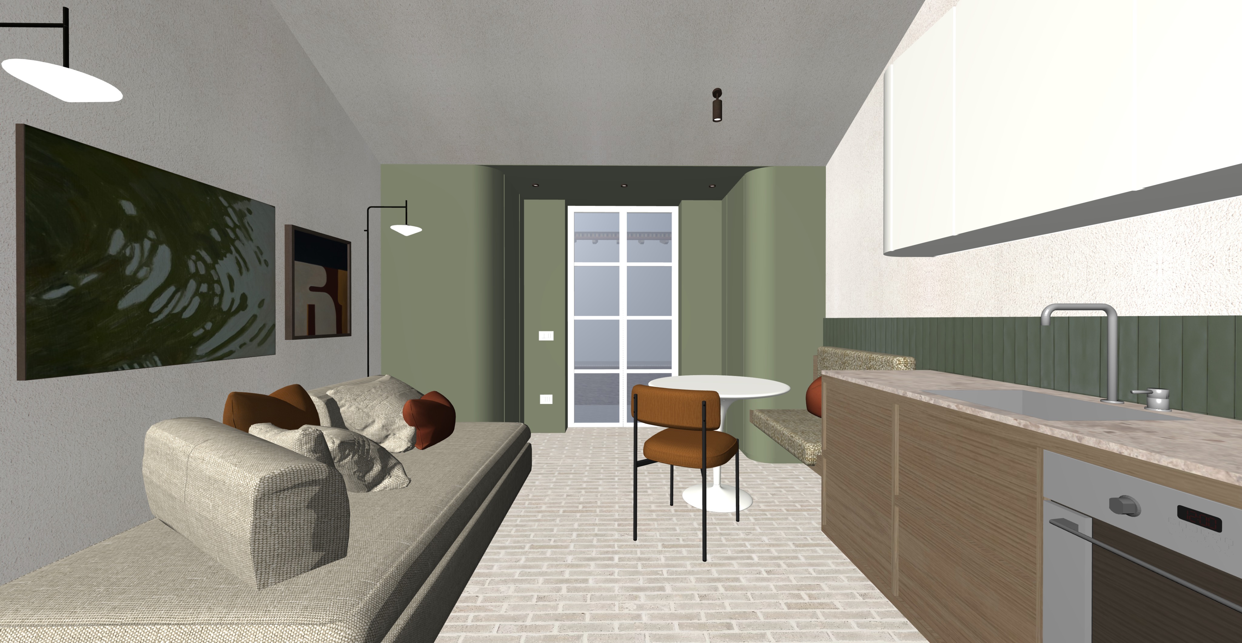 le pareti sono intonacate bianco caldo mantieni tessuto divano aggiungi strip led sotto pensile cucina lavabo e rubinetto in acciaio spazzolato tavolo laccato bainco opaco
